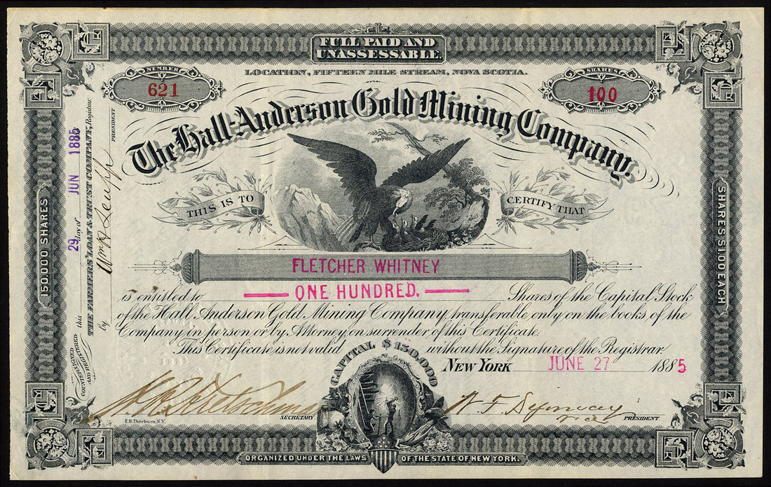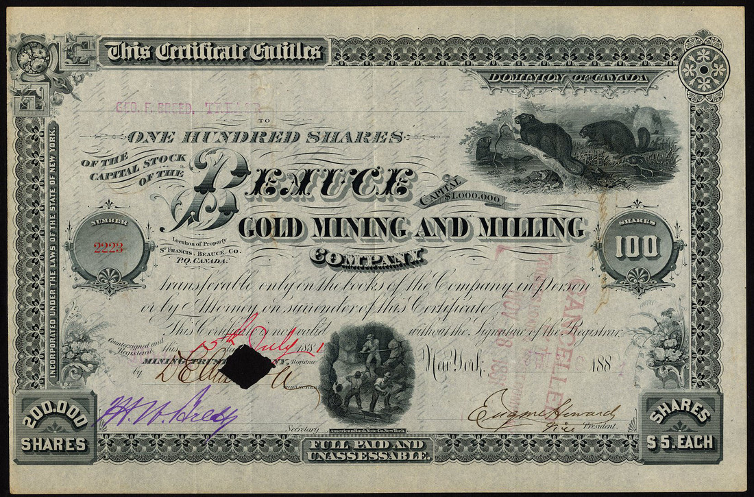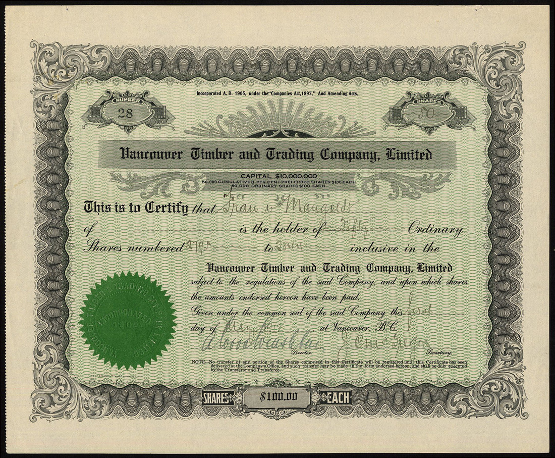 Canada: Hall-Anderson Gold Mining Co., $1 shares, 1885; Beauce Gold Mining & Milling Co., 100 shares of $5, 1881, cancelled, both attractive US style pieces with vignettes; Vancouver Timber and Trading Company Ltd., $100 ordinary shares, Vancouver, B.C. (1918), signed by Albo von Alvensleben as Director, black and green, green seal; together with other Canadian certificates comprising Alberta Canadian Oil Co, 1911; Bear Hydraulic Mining Co. Ltd., 1908; Canadian General Mining Co. Ltd., circa 1905; Piedmont Petroleum Products Co. Ltd., 1914; White Island Sulphur Co. Ltd., 1913; East Canada Power & Pulp Co. Ltd., 1911; Canadian Mortgage Association, Paris, 1910, very attractive pieces, with coupons (3 examples), and a small group of Grand Trunk Railway Company of Canada, first preference stock (2), second preference stock (2), third preference stock (3) and Consolidated stock (2), dates ranging from 1902 to 1922, mixed condition but mostly very fine, some better. (21)