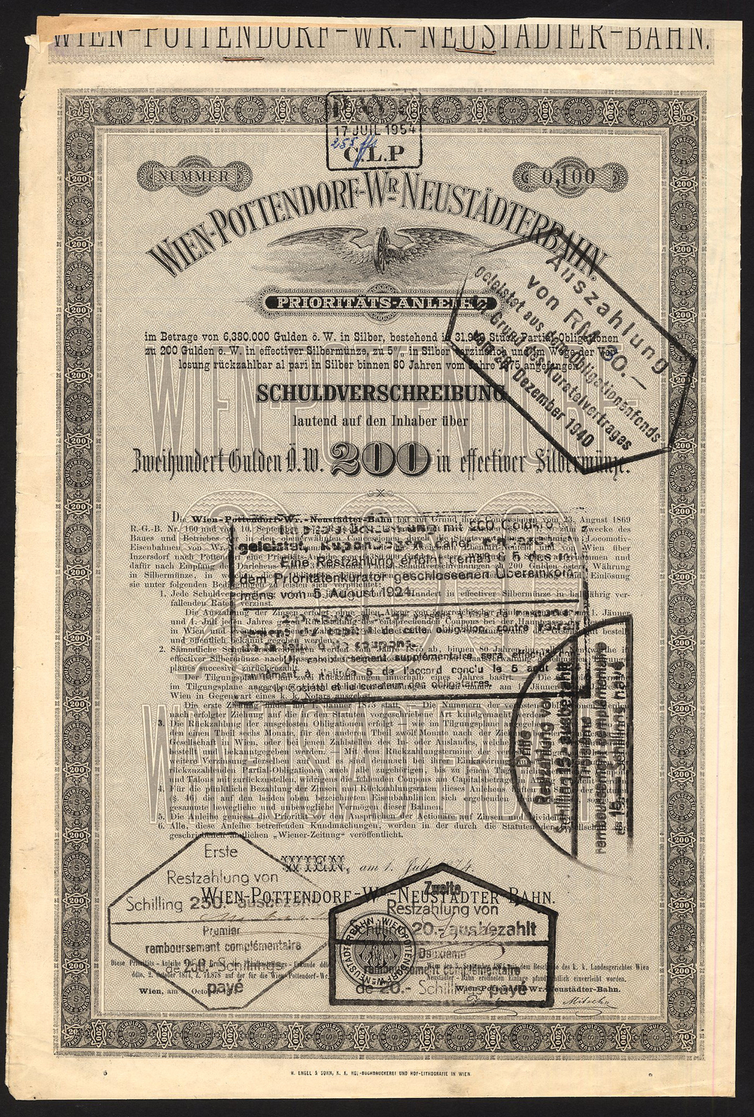 Austria: Wien-Pottendorf-Wr Neustädterbahn, schuldverschreibung 200 gulden, 1874, no.0100, ornate border, winged wheel, black, with coupons, several endorsements on face, extremely fine.