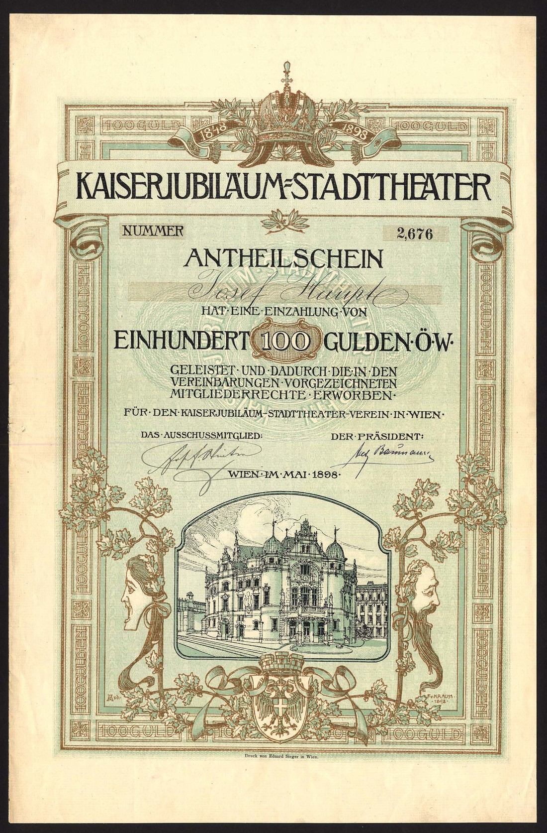 Austria: Kaiserjubilaum - Stadttheater, antheilschein, 100 gulden, Vienna 1898, no.2676, lovely vignette of theatre at bottom, green and brown, with coupons, extremely fine.