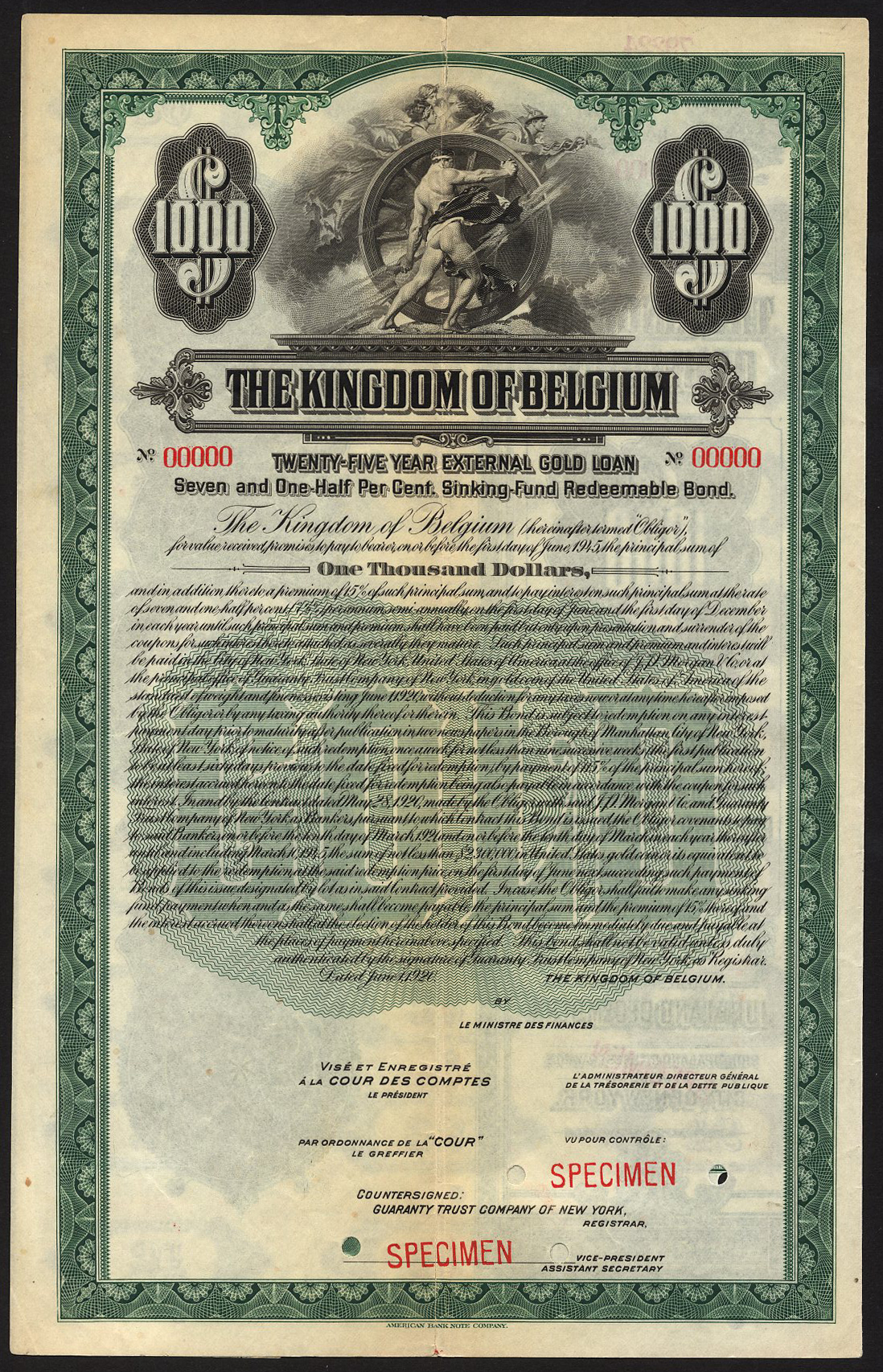 Belgium: Kingdom of Belgium, 25-Year 7½% External Gold Loan, a specimen bond for $1000, 1920, from the ABNCo. archives, allegorical figures at top, green and black, with coupons, numbered 00000 and overprinted SPECIMEN in red, very fine and rare.