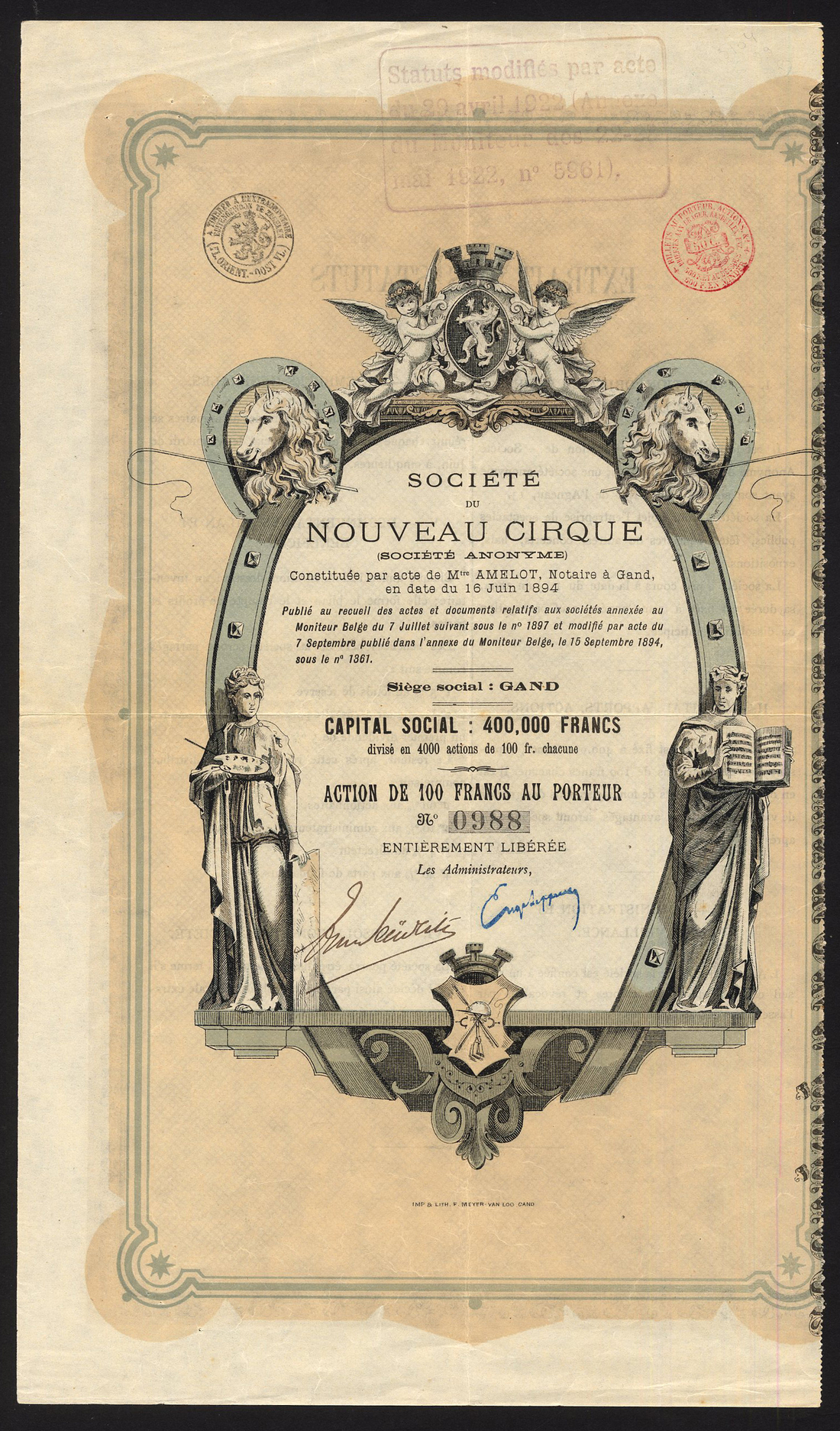 Belgium: Société du Nouveau Cirque, 100 franc share, Belgium 1894, no.0988, ornate 'horseshoe' border including cherubs with shield at top, horse heads to left and right, and allegorical figures at bottom, black, grey and buff, heavy folds, pin holes top left, about very fine.