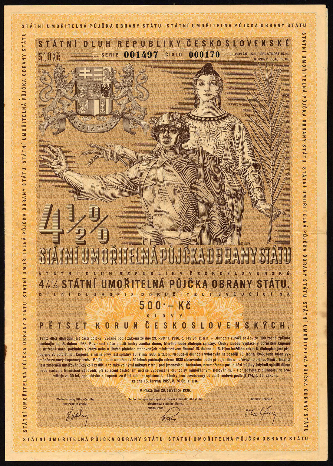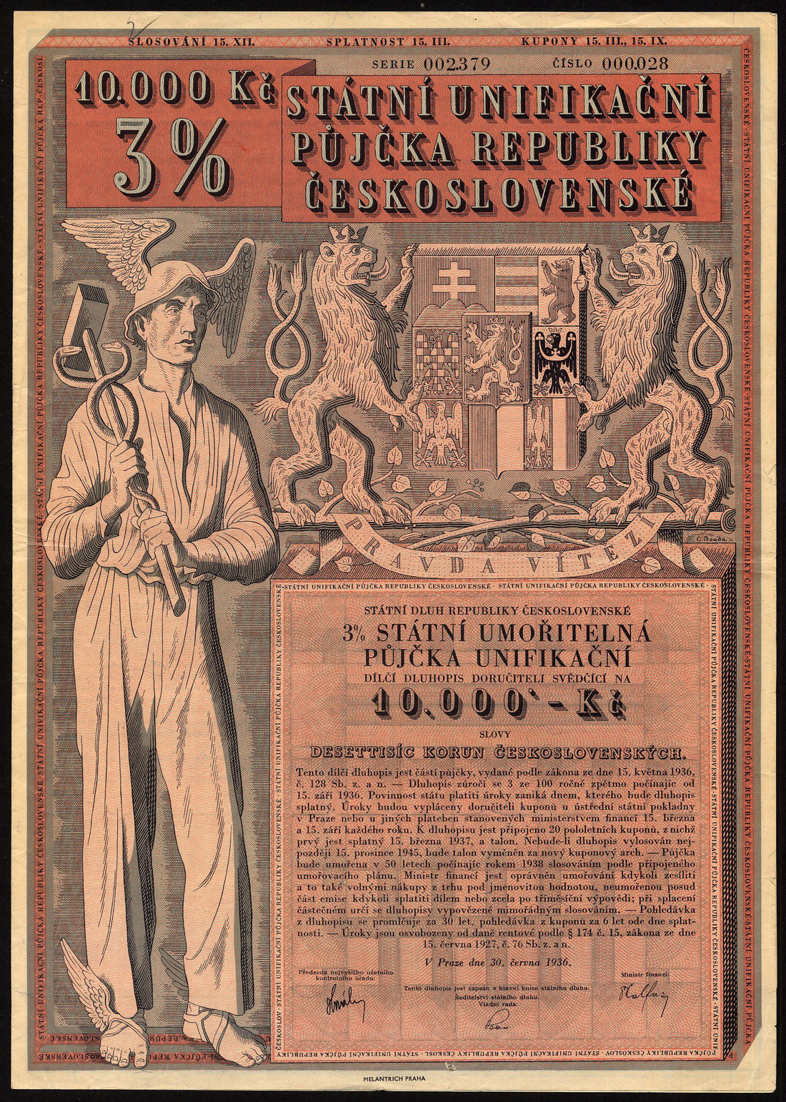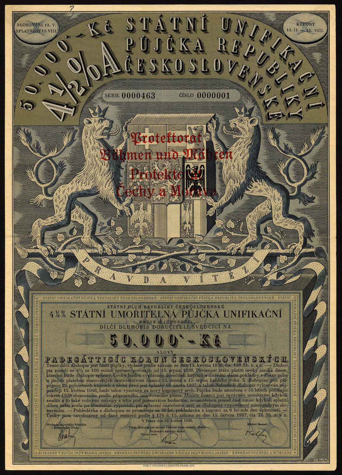 (x) Republic of Czechoslovakia: State Loans, a small collection comprising 4½% Unification Loan, 1936, bonds for 500, 10,000 and 50,000 korun, the last overprinted 'Protectorate of Bohemia and Moravia' in both German and Czech, large coat of arms flanked by rampant lions; 3% Unification Loan, 1936, bond for 10,000 korun, coat of arms flanked by rampant lions and stylised 'Mercury' standing at left; 4½ Defence Loan, 1936, 500 korun, soldier with allegorical female, coat of arms above left; earlier loans, 1922 -1926 (5), an interesting lot, some scarce, generally very fine. (10)