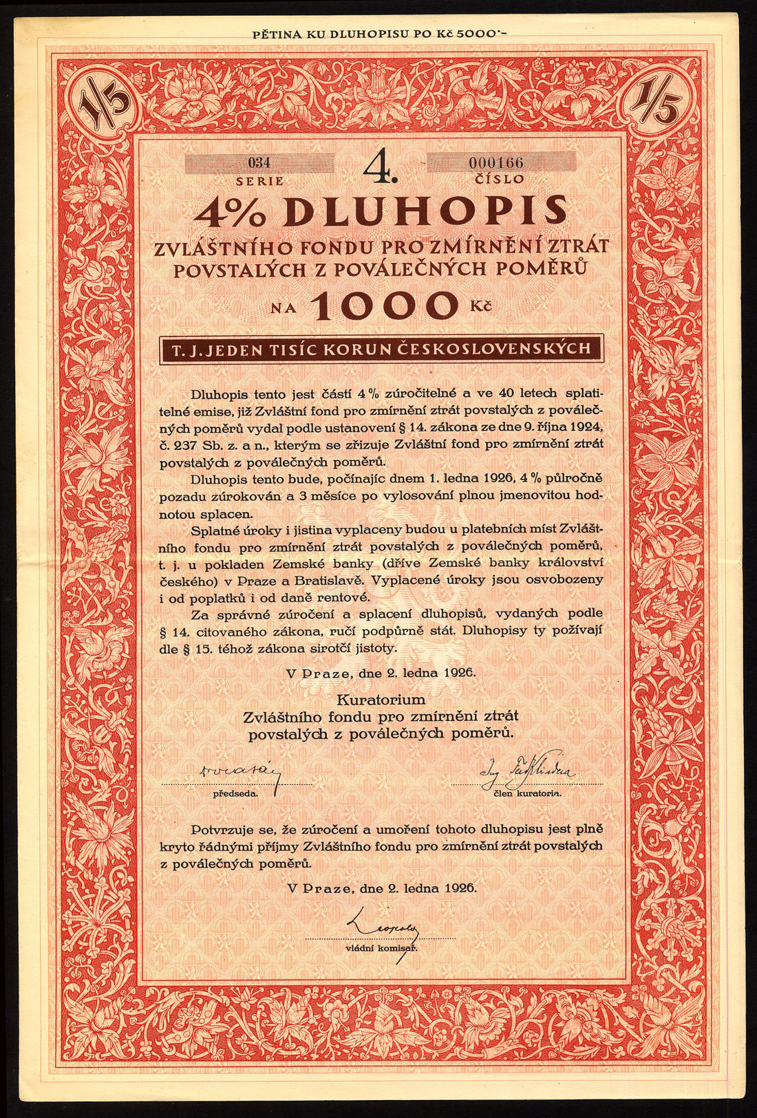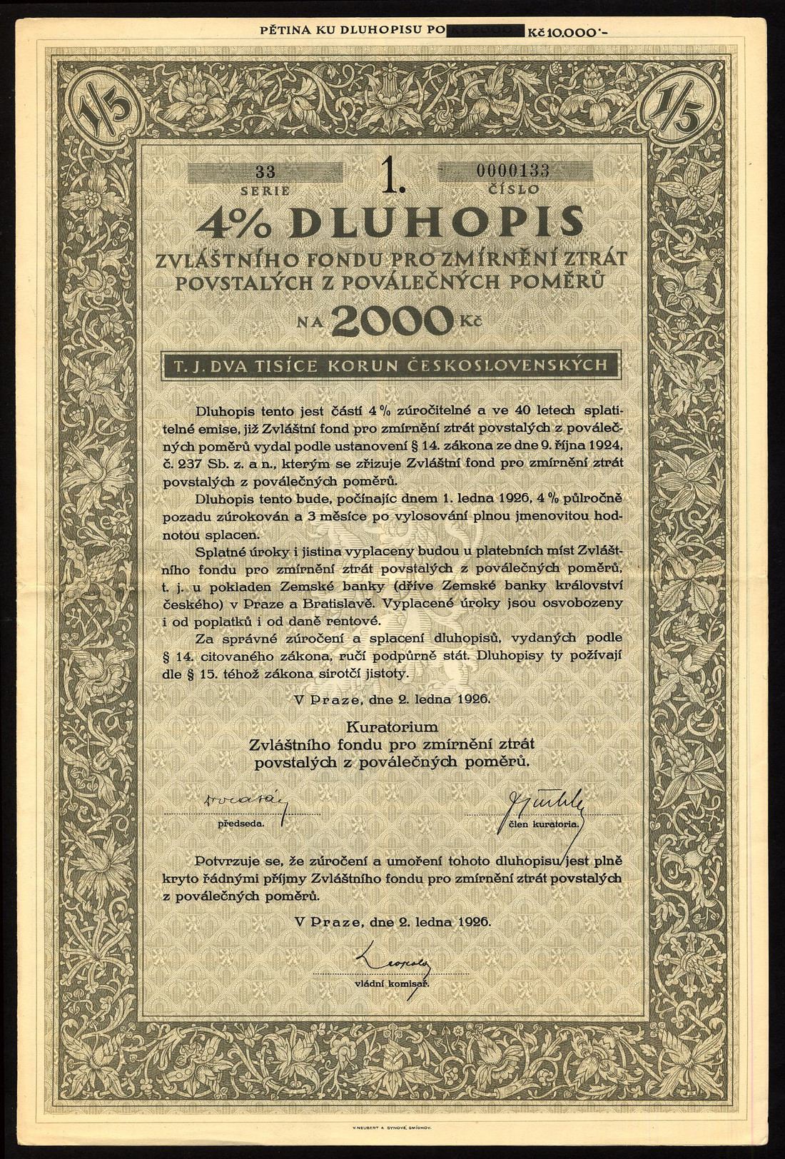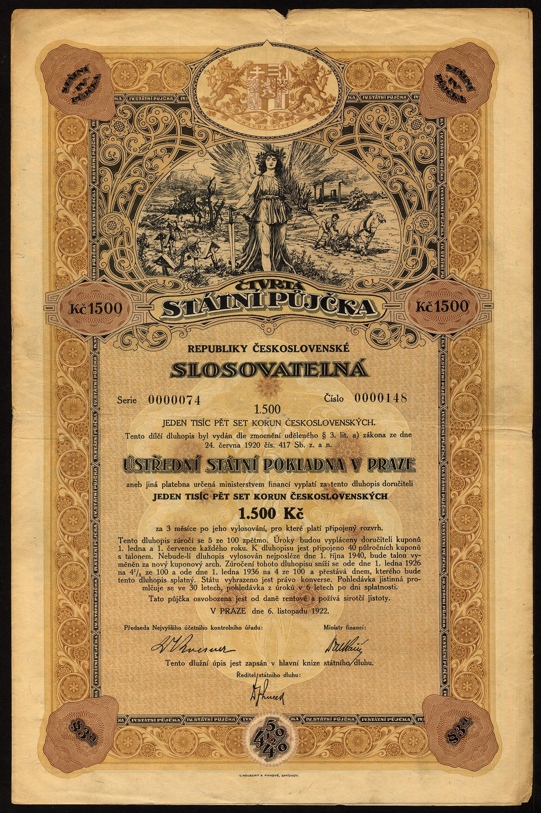 (x) Republic of Czechoslovakia: State Loans, a small collection comprising 4½% Unification Loan, 1936, bonds for 500, 10,000 and 50,000 korun, the last overprinted 'Protectorate of Bohemia and Moravia' in both German and Czech, large coat of arms flanked by rampant lions; 3% Unification Loan, 1936, bond for 10,000 korun, coat of arms flanked by rampant lions and stylised 'Mercury' standing at left; 4½ Defence Loan, 1936, 500 korun, soldier with allegorical female, coat of arms above left; earlier loans, 1922 -1926 (5), an interesting lot, some scarce, generally very fine. (10)