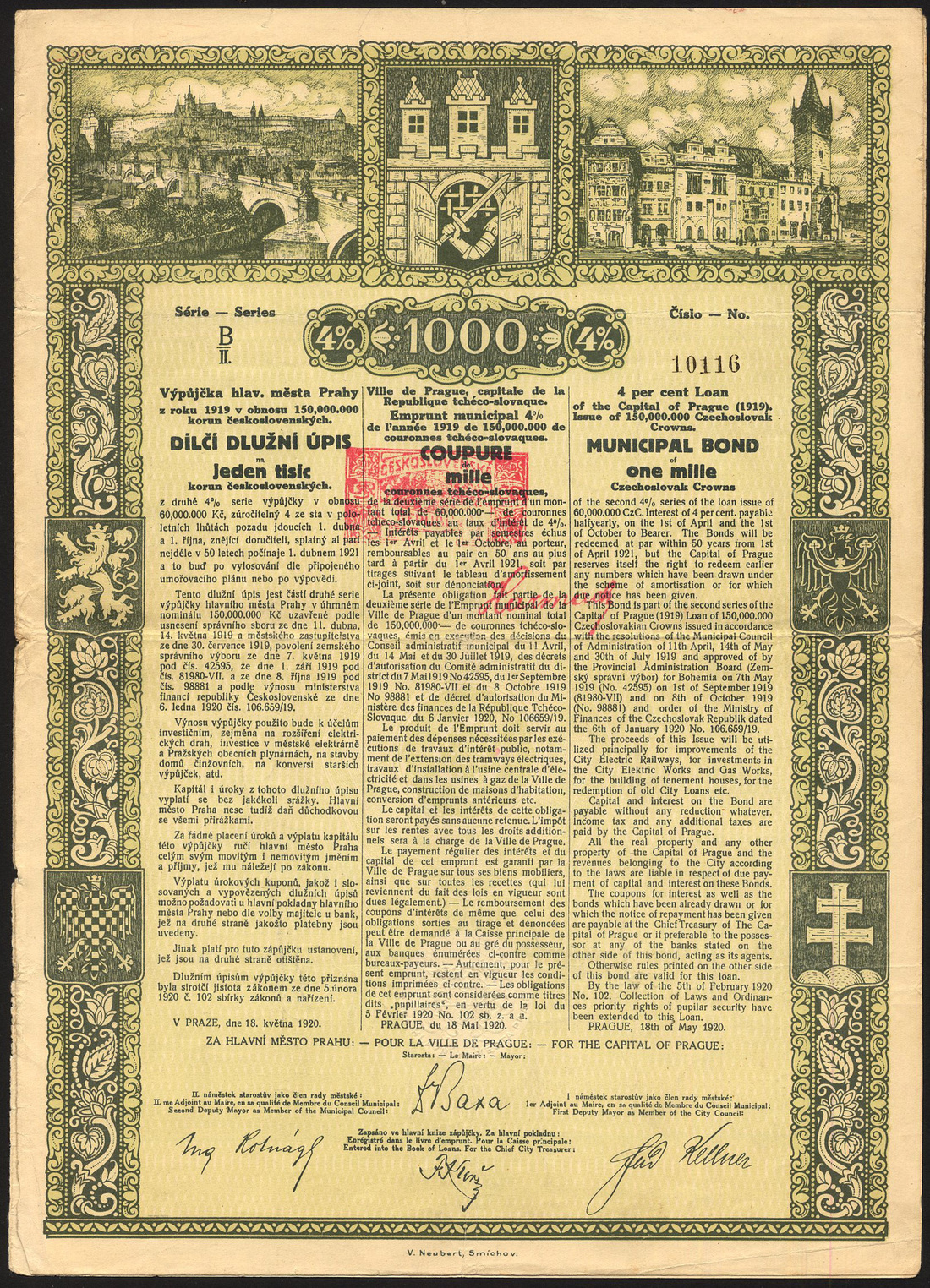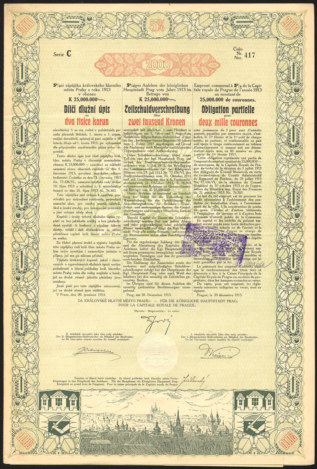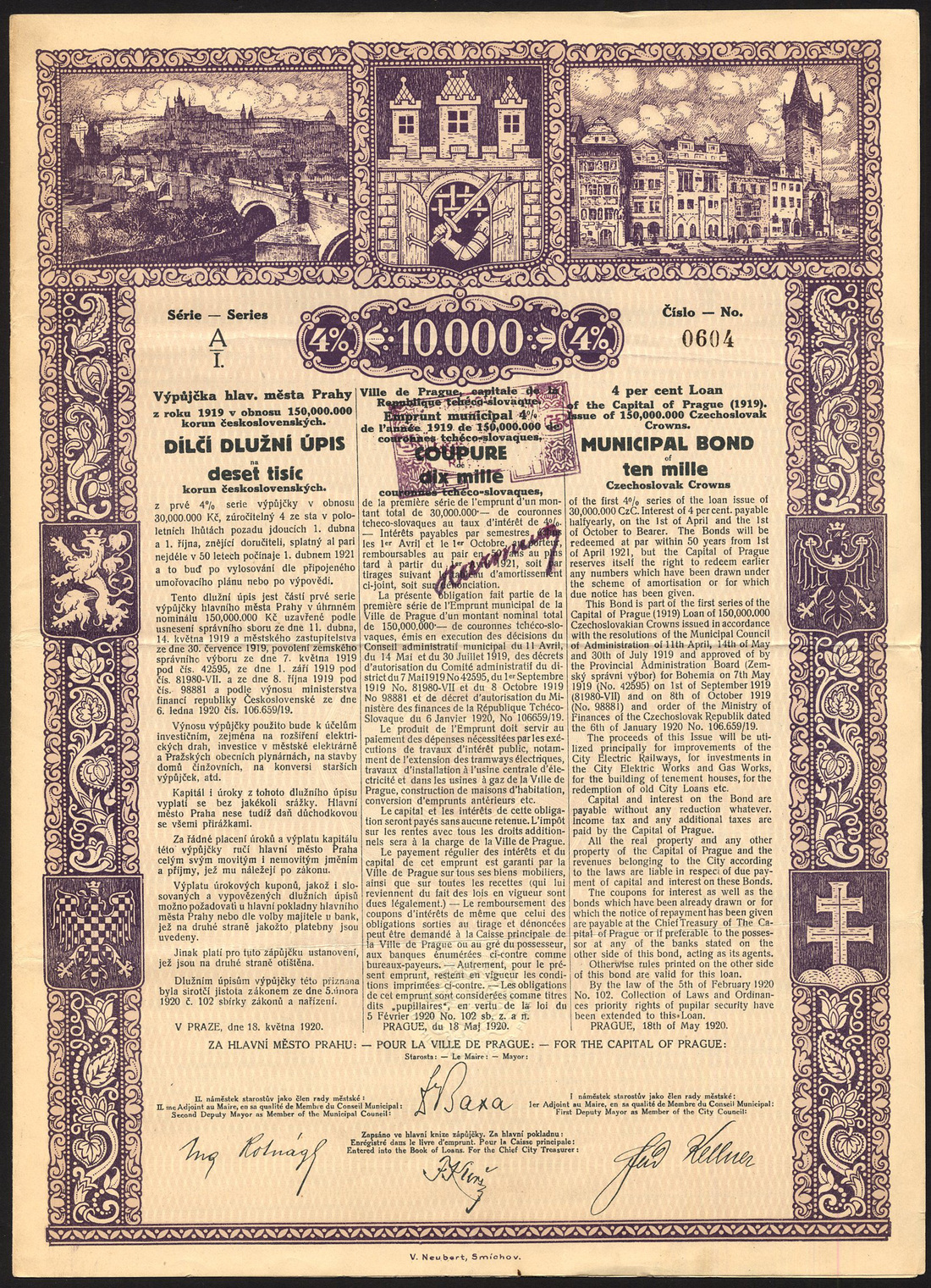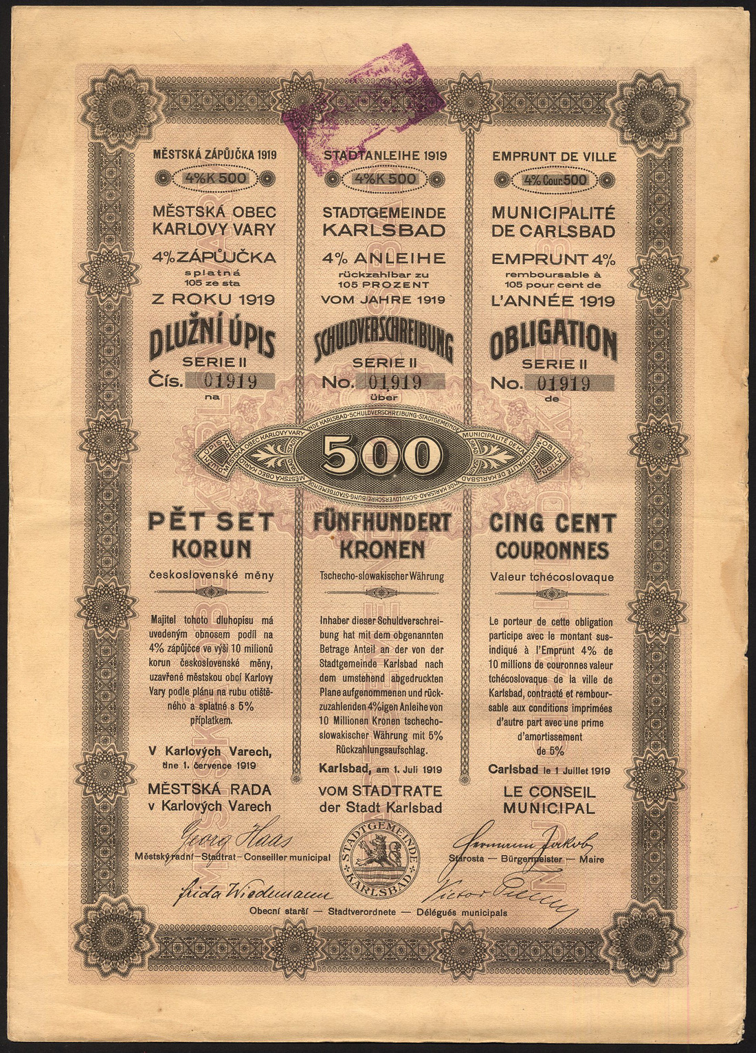 (x) Czechoslovakia: Municipal Loans comprising Carlsbad, 4% 1919, 500 korun; Prague, 5% Loan, 1913, 2000 korun, 2 examples; Prague, 4% Loan, 1919, 1000 korun and 10,000 korun, 2 examples, one with US ownership certificate attached, this rather poor condition, all with mauve handstamp of the Republic of Czechoslovakia applied during the 1920's, generally about very fine. (6)