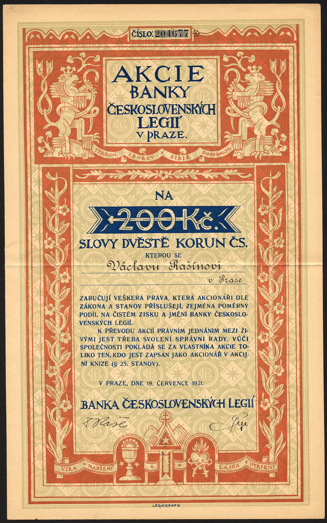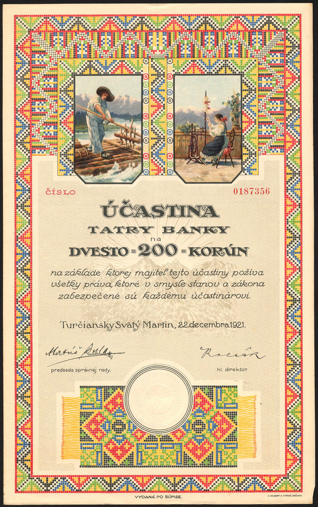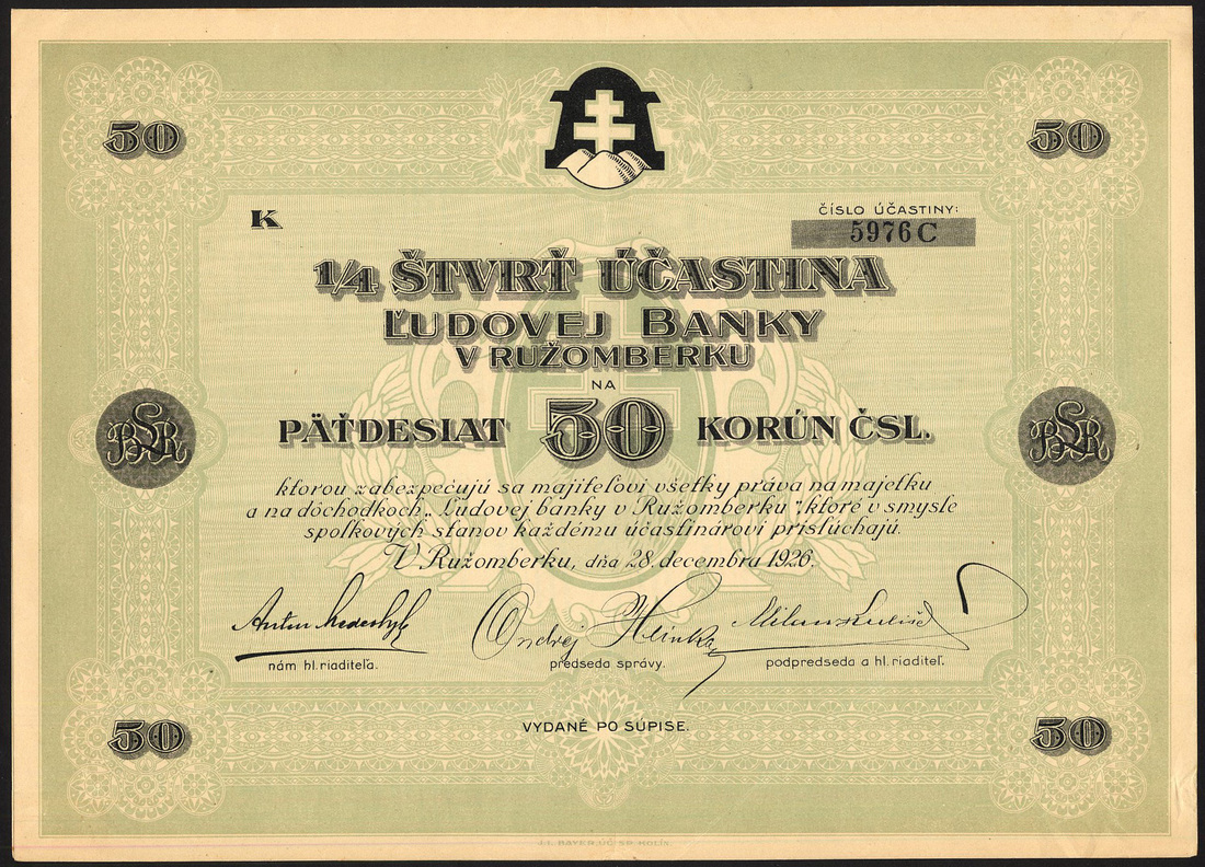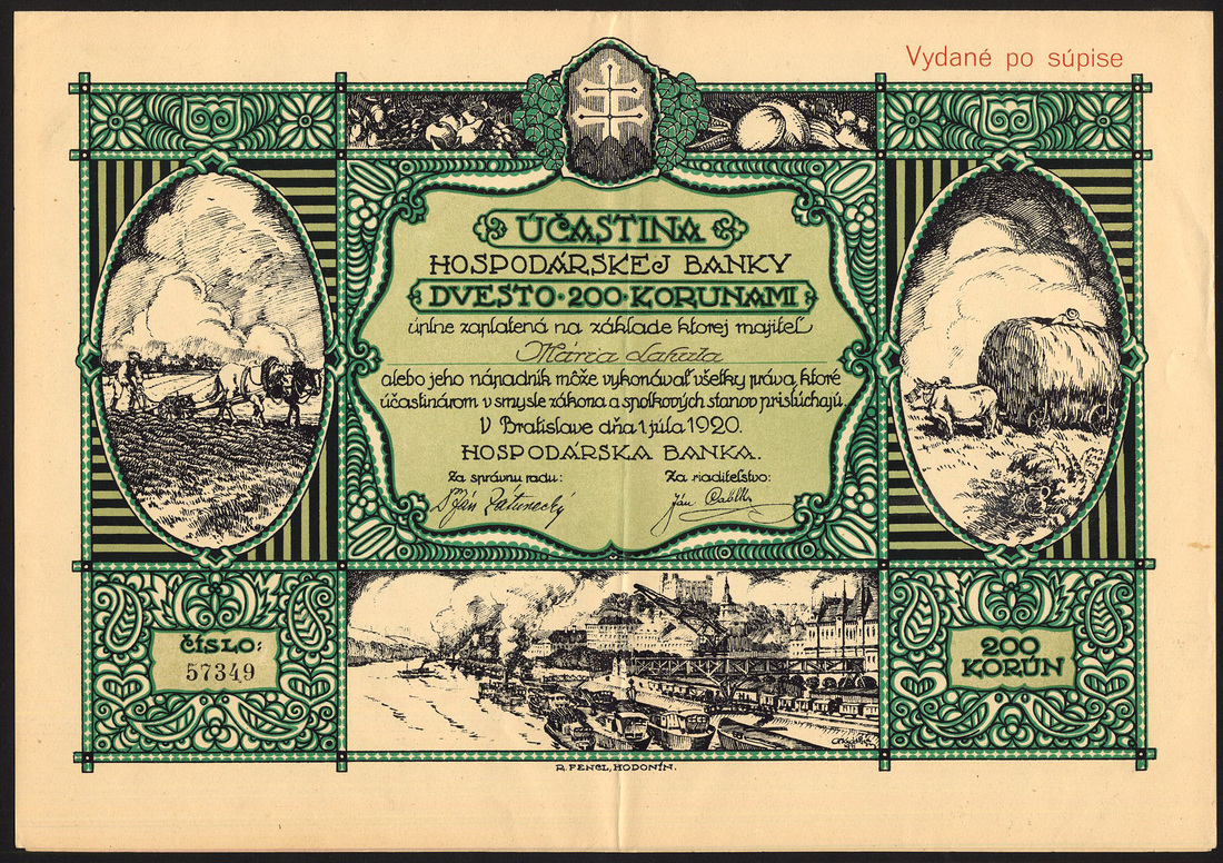 (x) Czechoslovakia: Banks; a small selection comprising Hospodarskej Banky, 200 korun, 1920, busy river scene and agricultural vignettes; Tatry Banky, 200 korun, 1921, multicoloured border and vignettes at top; Zivnostenske Banky, 200 korun, 1933; Banky Ceskoslovenskych Legii, 200 korun, 1921, and, Ludovej Banky, 50 korun, 1926, all with coupons, generally about extremely fine and better. (5)