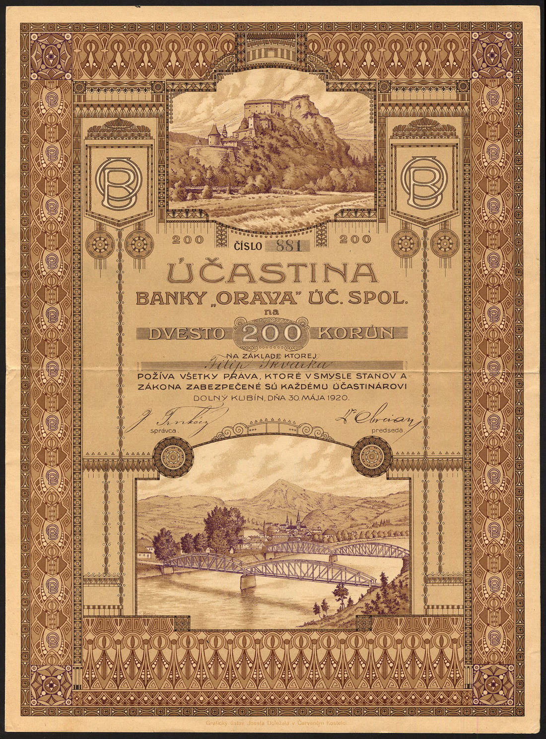 (x) Czechoslovakia: Banky "Orava" Úc.Spol, 200 korun share, Dolny Kubin 1920, no.881, attractive piece with vignette of Orava Castle at top, pair of girder bridges at bottom, brown, with coupons, centre fold, good very fine.