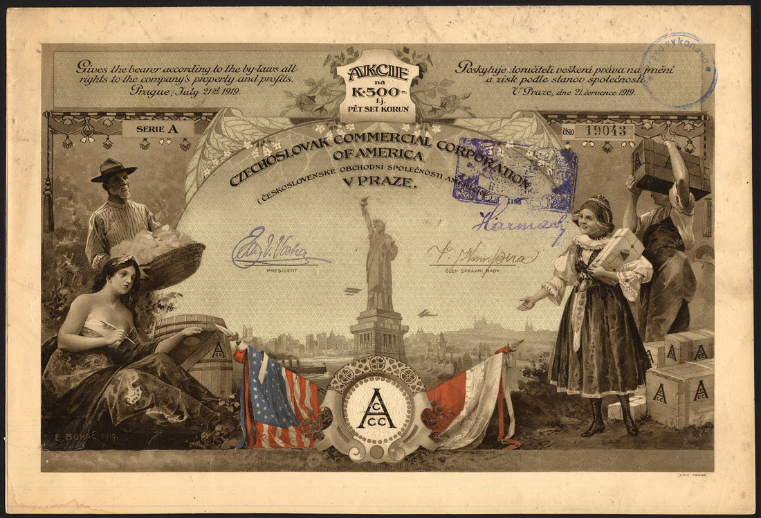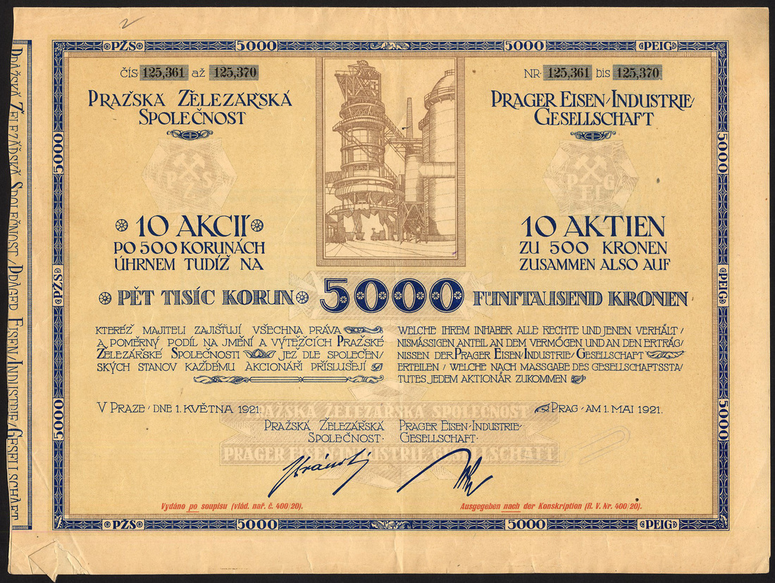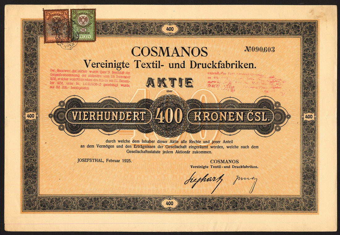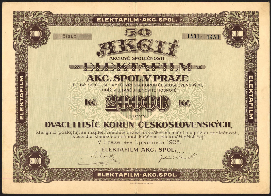 (x) Czechoslovakia: Czecholsovak Commercial Corporation of America, 500 korun share, 1919, statue of Liberty in centre, Americans at left, Czechs at right, multicoloured flags at bottom, designed and signed by E. Bohac in 1919, sadly this has several dozen very small digs on the surface and a 30mm tear at left; together with other Czech pieces comprising Prager Eisen Industrie Ges., 10 shares of 500 korun, 1921, ironworks in centre, small tear at bottom; Etablissements Skoda, 10 shares of 320 korun, 1920; Zuckerfabriken Mahr.Kromau-Oslava AG, 200 korun, 1933; Export Malzfabriken Schindler & Steina, 5 shares of 300 korun, 1930; Roth-Kosteletzer Spinnerei und Weberei, 200 korun, 1937; Elektafilm, 50 shares of 400 korun, 1928; Ersten Schattauer Thonwarenfabriks AG, vorm. C. Schlimp, 400 korun share, 1926, 3 examples, and, Cosmanos Spojene tovarny textilni a tiskarny latek, 400 korun, 1925, generally very fine to extremely fine unless stated. (11)