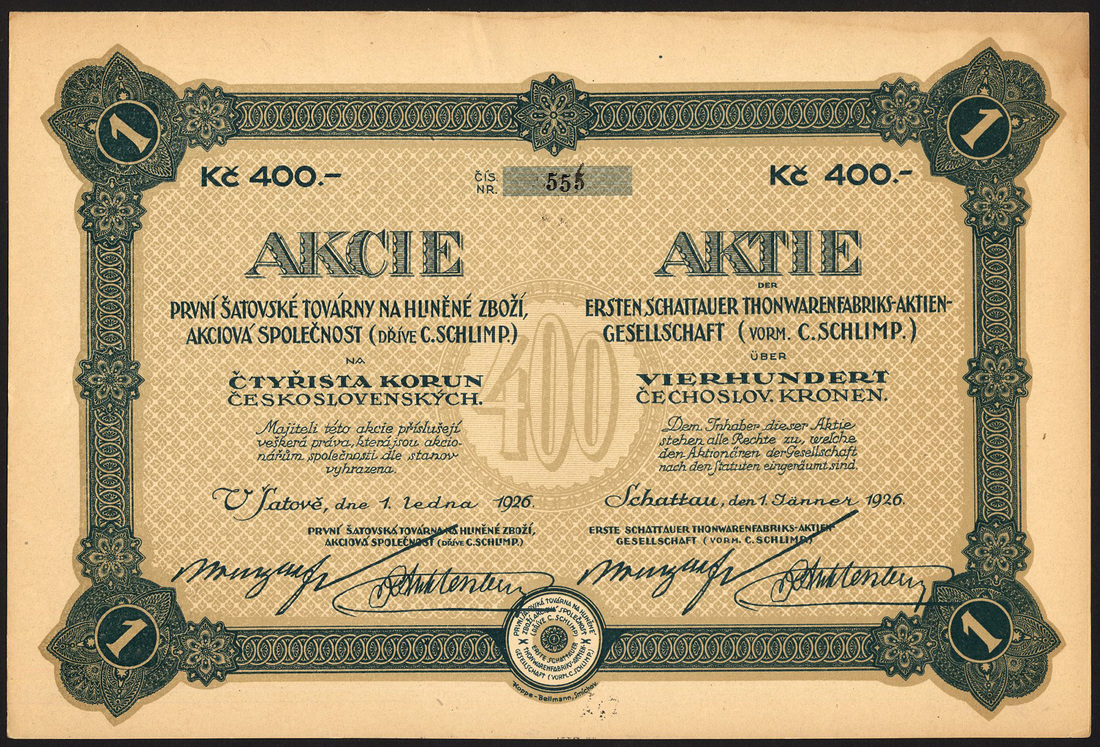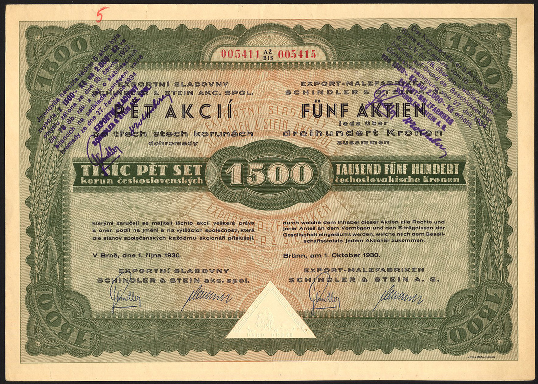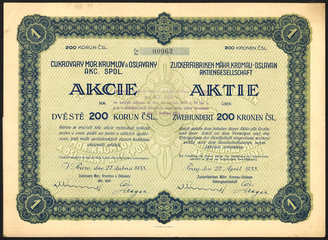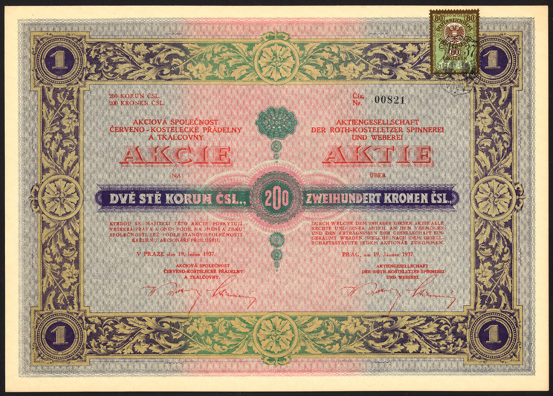 (x) Czechoslovakia: Czecholsovak Commercial Corporation of America, 500 korun share, 1919, statue of Liberty in centre, Americans at left, Czechs at right, multicoloured flags at bottom, designed and signed by E. Bohac in 1919, sadly this has several dozen very small digs on the surface and a 30mm tear at left; together with other Czech pieces comprising Prager Eisen Industrie Ges., 10 shares of 500 korun, 1921, ironworks in centre, small tear at bottom; Etablissements Skoda, 10 shares of 320 korun, 1920; Zuckerfabriken Mahr.Kromau-Oslava AG, 200 korun, 1933; Export Malzfabriken Schindler & Steina, 5 shares of 300 korun, 1930; Roth-Kosteletzer Spinnerei und Weberei, 200 korun, 1937; Elektafilm, 50 shares of 400 korun, 1928; Ersten Schattauer Thonwarenfabriks AG, vorm. C. Schlimp, 400 korun share, 1926, 3 examples, and, Cosmanos Spojene tovarny textilni a tiskarny latek, 400 korun, 1925, generally very fine to extremely fine unless stated. (11)