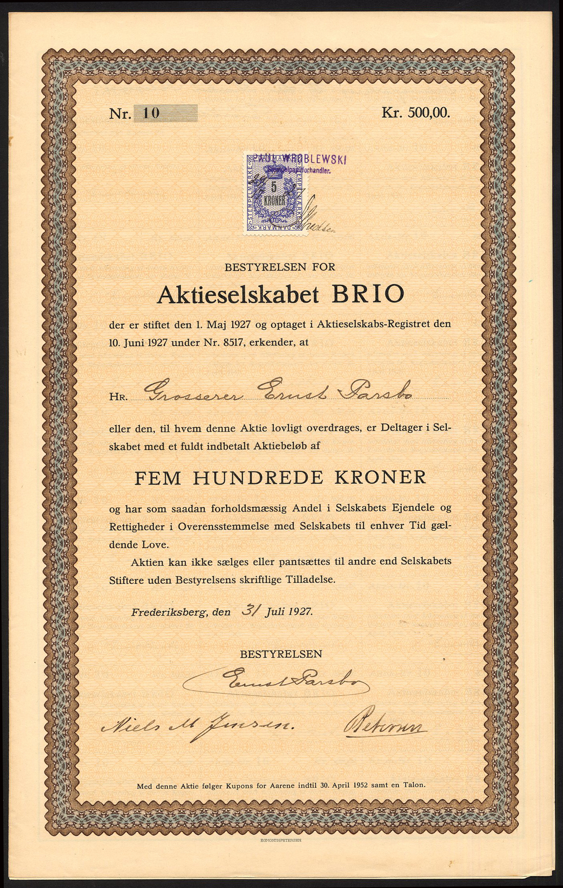 (x) Denmark: Brio, 500 krone share, Frederiksberg 1927, no.10, ornate and colourful border, black, brown and blue, with coupons, extremely fine.