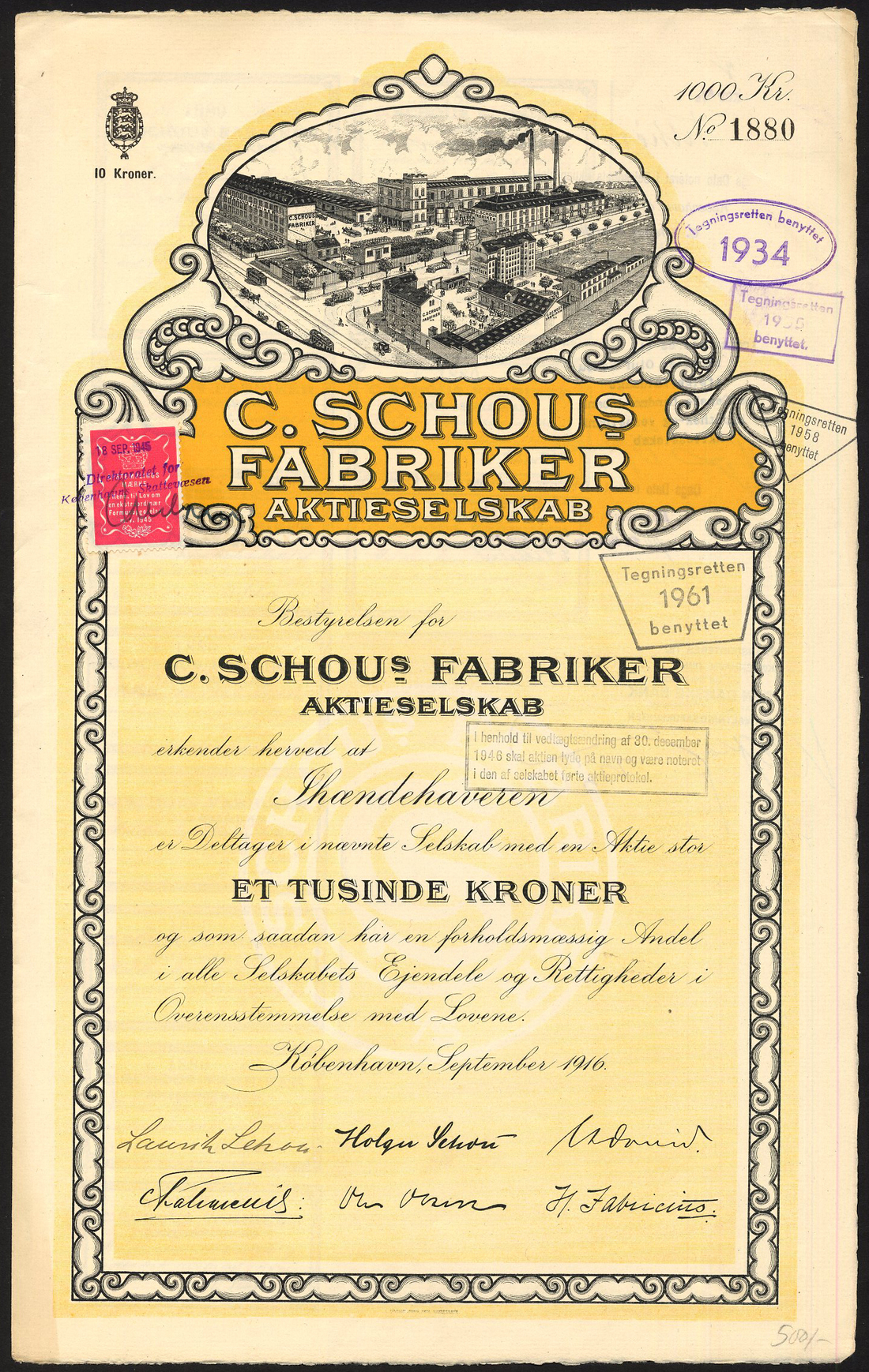 (x) Denmark: C. Schous Fabriker, 1,000 krone share, Copenhagen 1916, no.1880, large vignette of factory and company premises at top, ornate border, black and yellow, with coupons, good very fine.