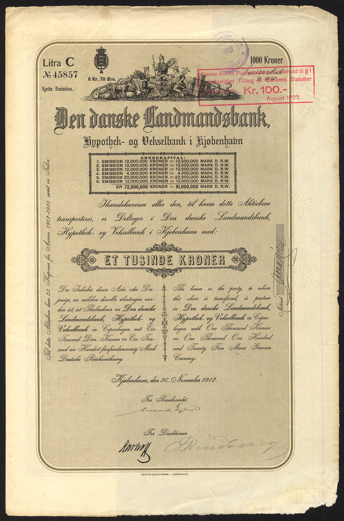(x) Denmark: Danske Landmandsbank, 1,000 krone share, Copenhagen 1912, no.45857 'C', allegorical figures with agriculture and fishing at top, black with olive underprint, with coupons, damage to top and right edge, fine to very fine.