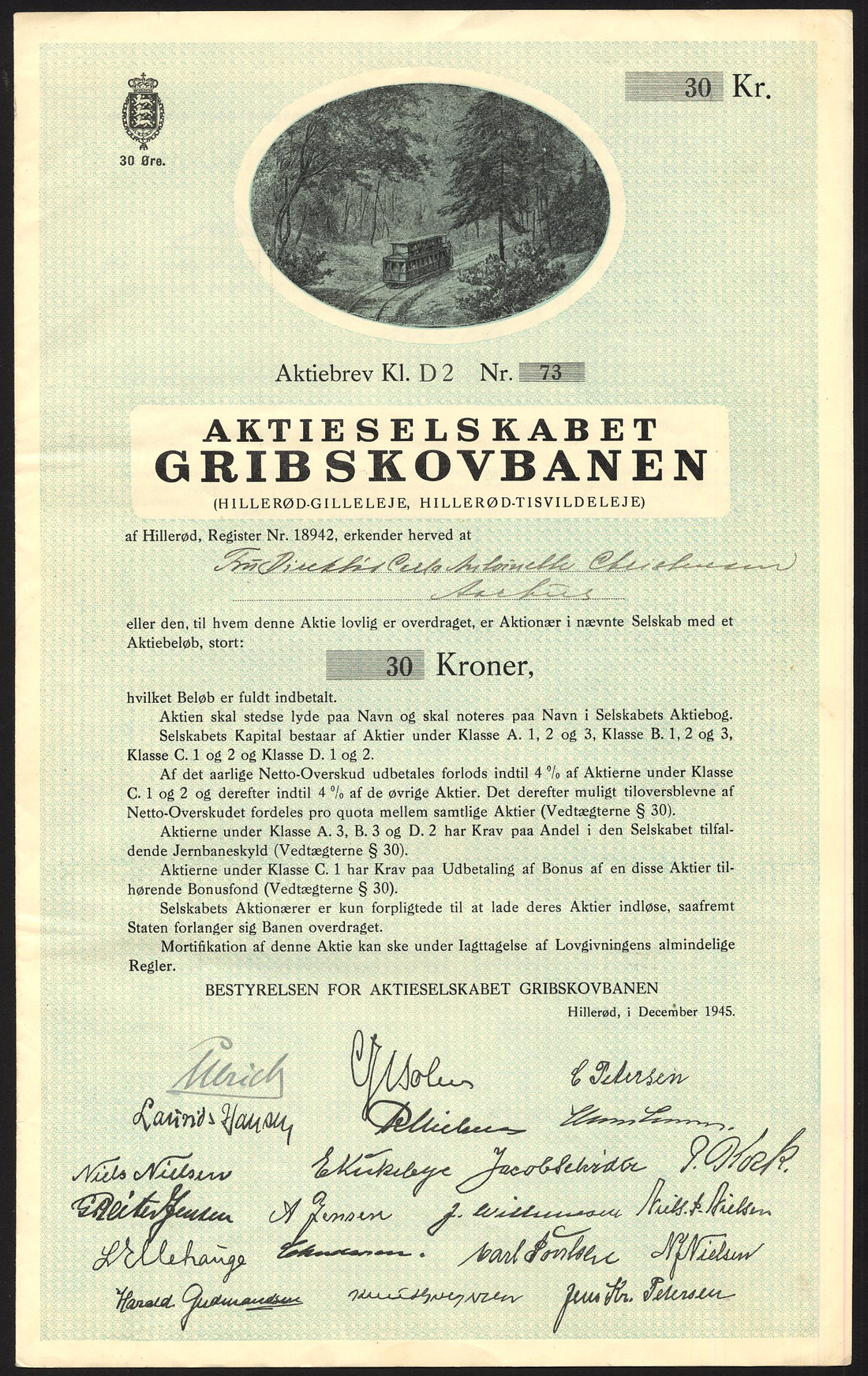 (x) Denmark: Gribskovbanen, certificate for 30 krone share, 1945, no.73, vignette at top of the small local railway in forest, black with blue underprint, with coupons, good very fine.