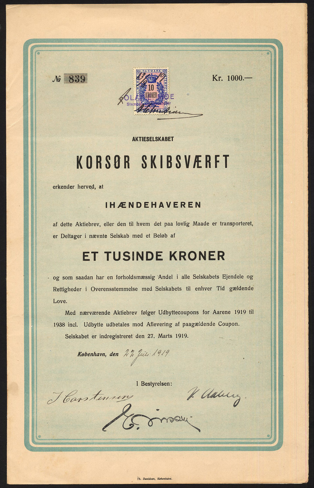 (x) Denmark: Korsør Skibsværft, 1,000 krone share, Copenhagen [1919], no.839, bold border, black and blue-green, with coupons, good very fine.