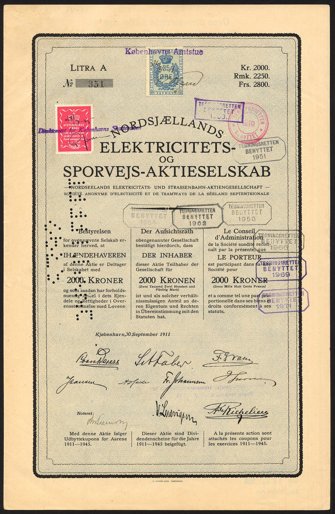 (x) Denmark: Nordsjællands Elektricitets Sporvejs, 2,000 krone share, Copenhagen 1911, no.351, bold border, black with blue underprint, text in Danish, German and French, punch cancelled, good very fine.