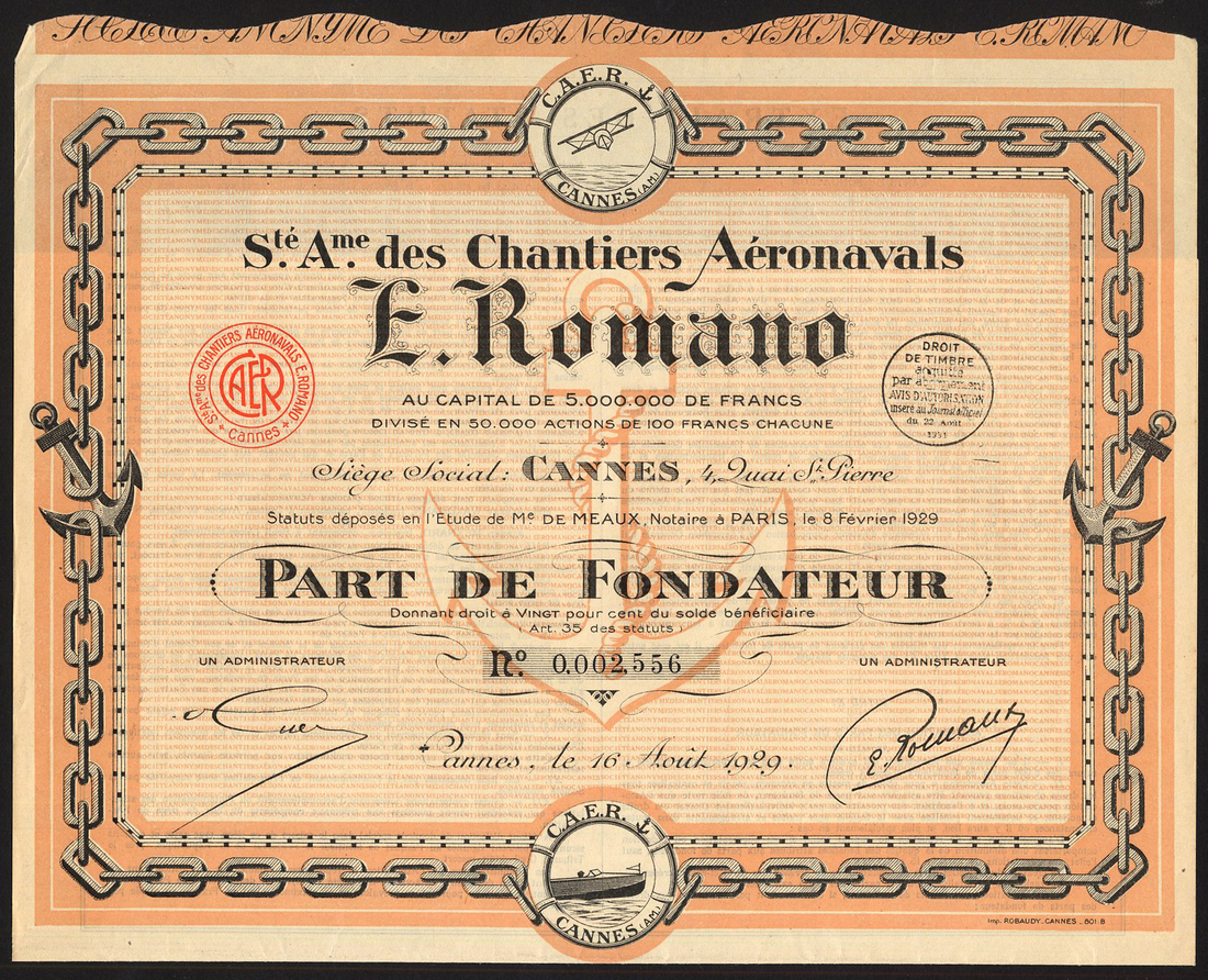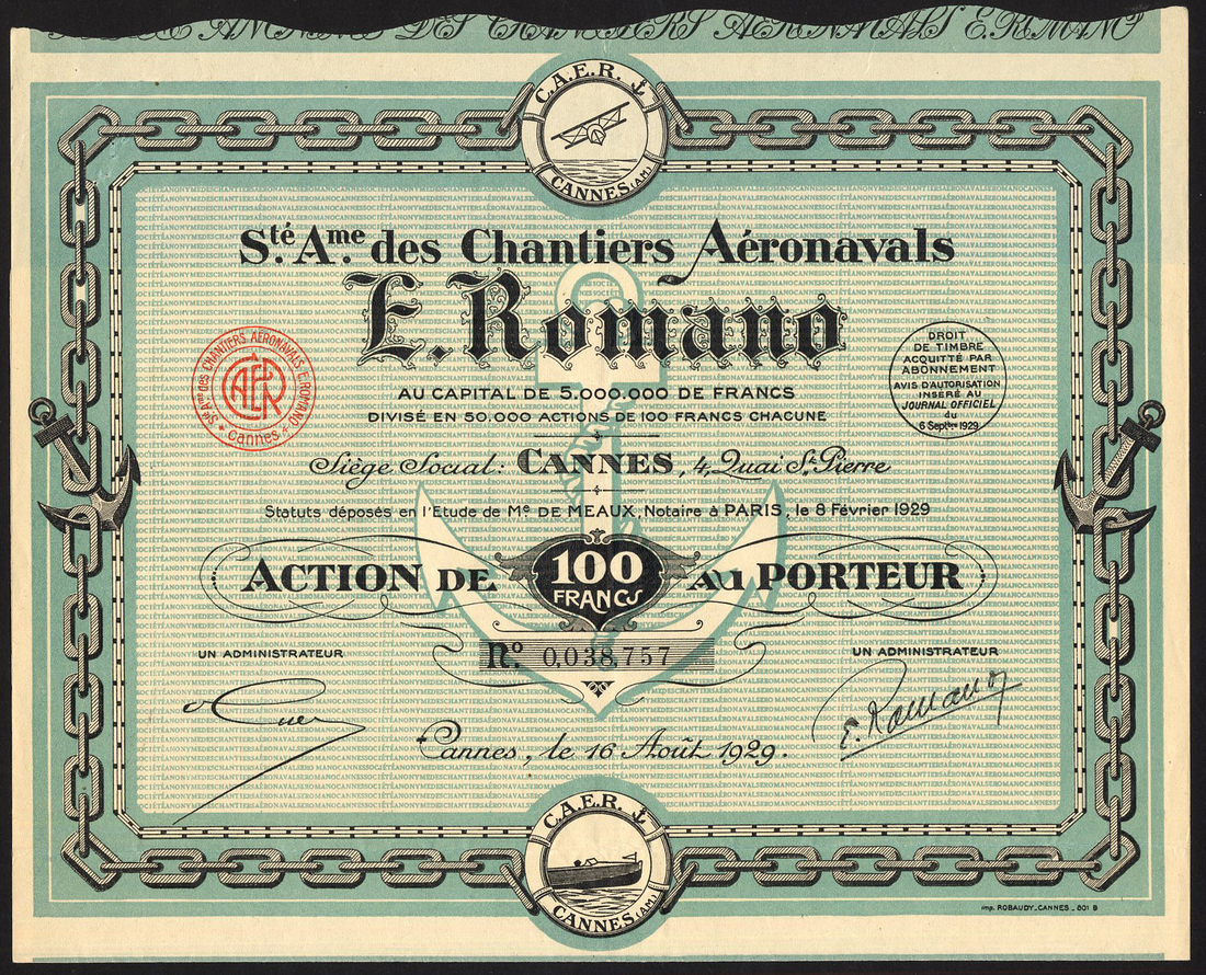 France: S.A. Chantiers Aéronavals E. Romano, founders share, and 100 franc share, both Cannes 1929, ornate border with chain and anchors, aircraft at top and ship at bottom, black with peach, and black with blue-green respectively, both with coupons, both about extremely fine. (2)