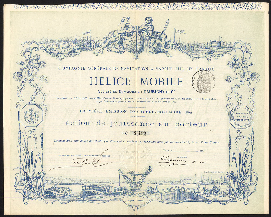 France: Compagnie Générale de Navigation a Vapeur sur les Canaux Hélice Mobile, bearers share, Paris 1863, no.2412, lovely ornate border incorporating harbour scenes, reeds, anchors, and allegorical figures at top, blue with pale green underprint, with coupons, heavy centre crease, about very fine.