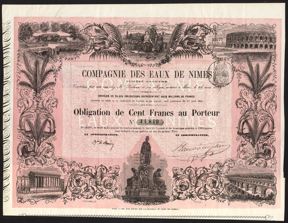 France: Compagnie des Eaux de Nimes, 100 franc bond, Paris 1869, no.14849, very attractive piece with vignettes of some of the city's Roman buildings such as the Pont du Gard, Maison Carrée and the second century amphitheatre, water fountain bottom centre, black with pink underprint, with coupons, very fine.