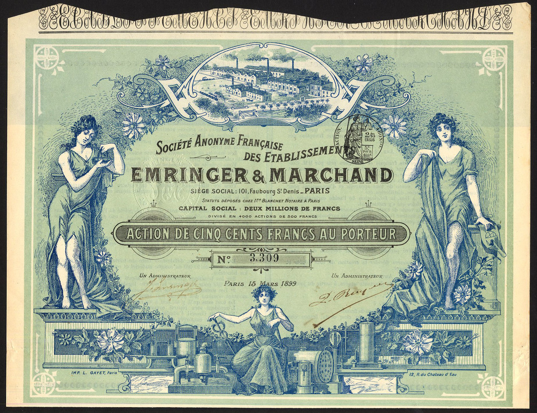 France: S.A. Francaise des Etablissements Emringer & Marchand, 500 franc share, Paris 1899, no.3309, attractive piece with border of allegorical females, factory buildings at top, blue and green, with coupons, good very fine.