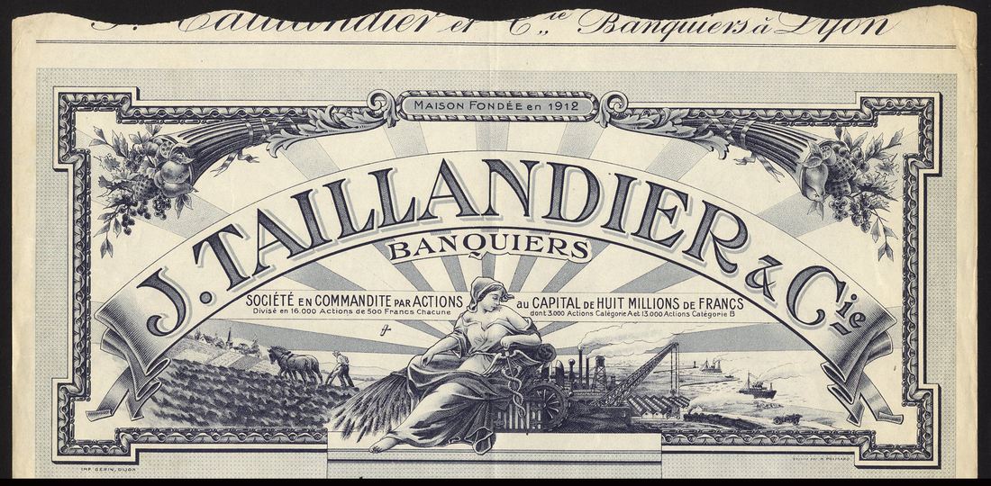 France: J. Taillandier & Cie, Banquers, 500 franc 'B' share, Lyon [1924], no.10631, large vignette of allegorical female in front of agricultural, factory and shipping scenes, cornucopia in top corners, black with grey underprint, with coupons, very fine.