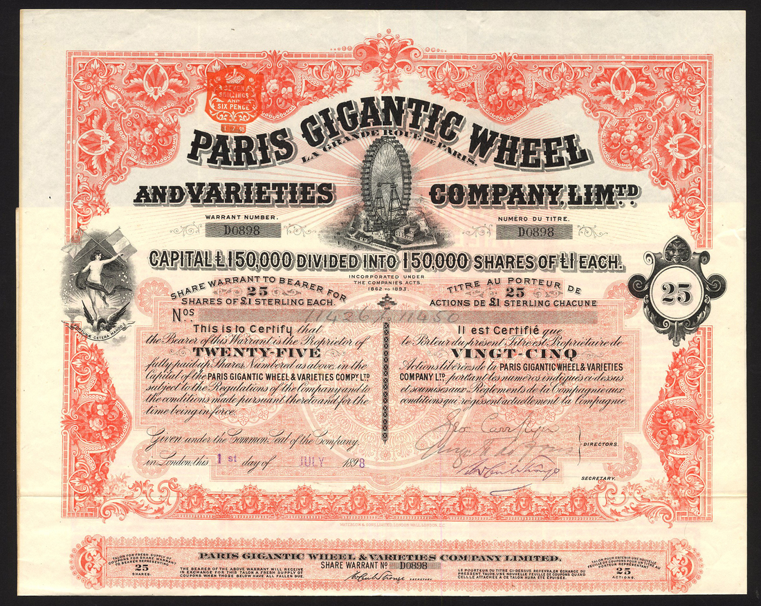 France: Paris Gigantic Wheel and Varieties Co. Ltd., bearer warrant for 25 shares of £1, London 189[8], no.D0898, Ferris wheel and buildings in centre, naked Fortuna on winged wheel with flags of France and England at left, red and black, printed by Waterlow & Sons, with coupons, about extremely fine and scarce denomination.