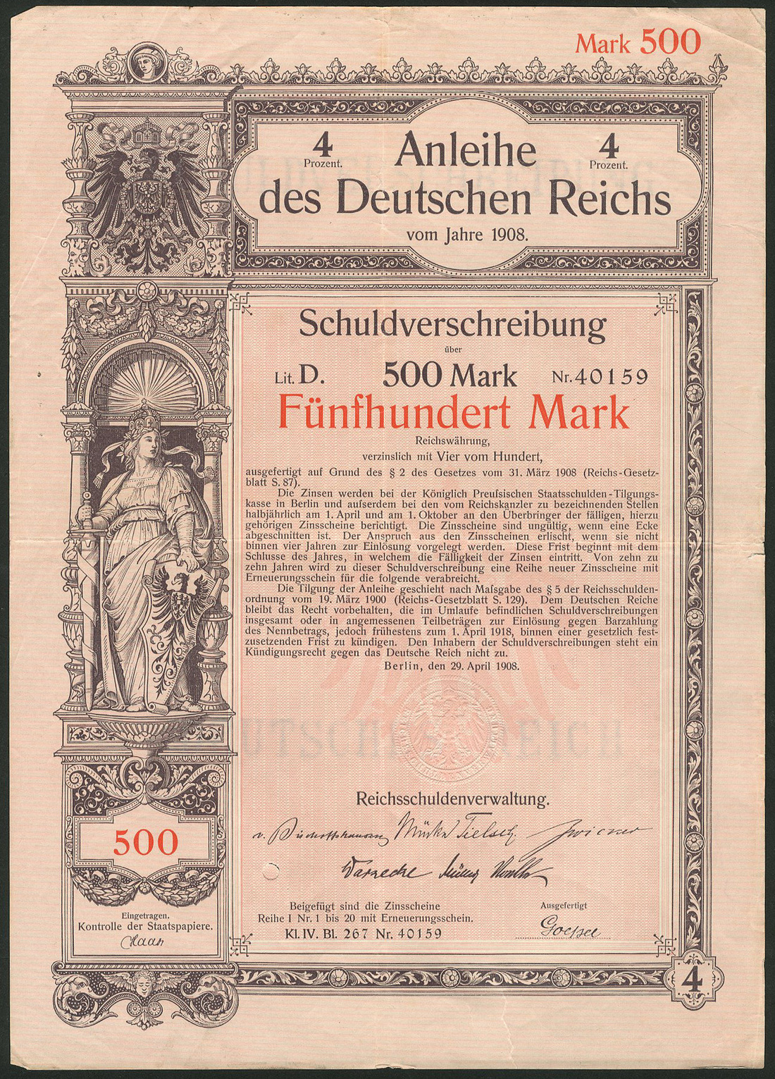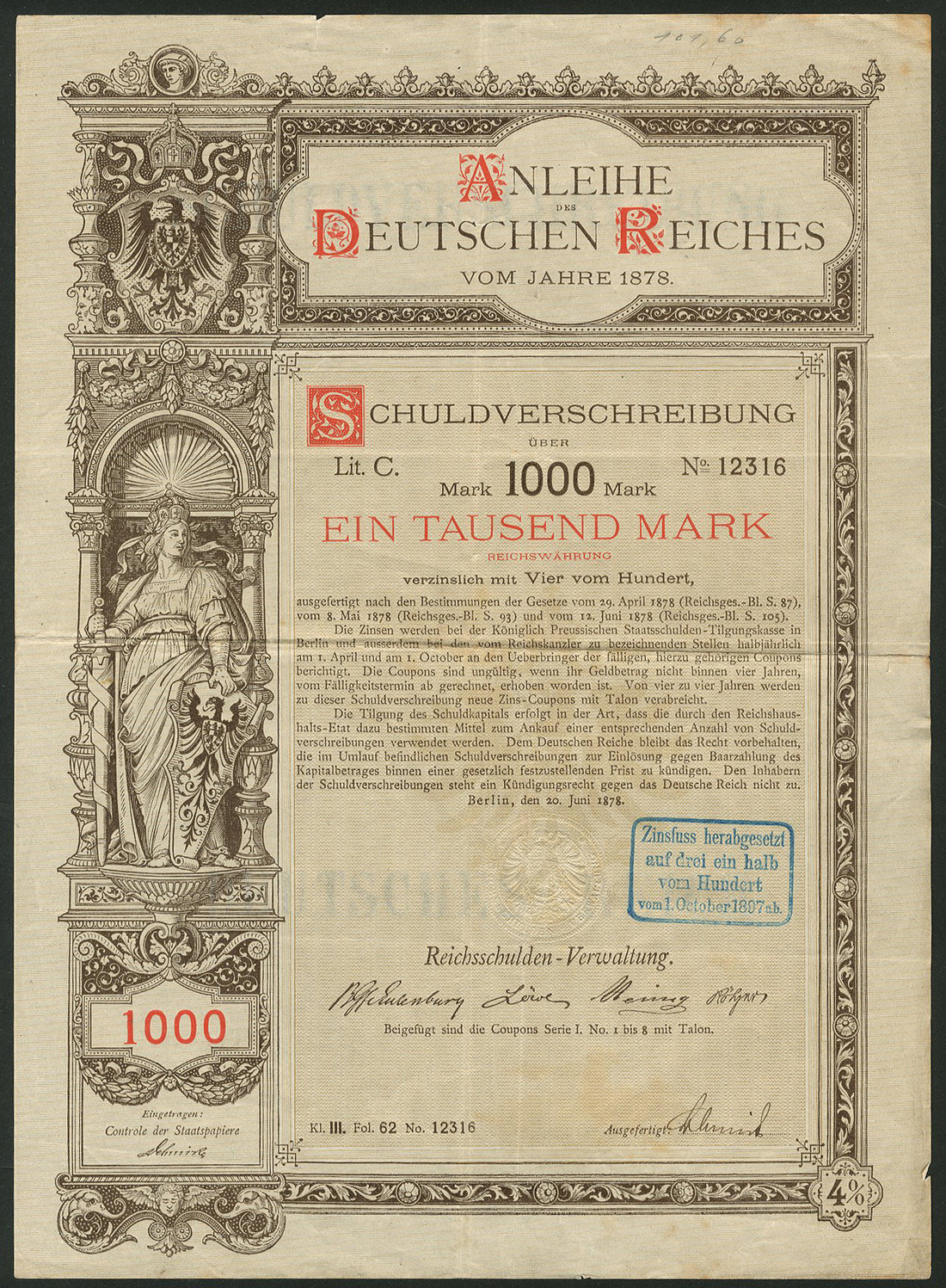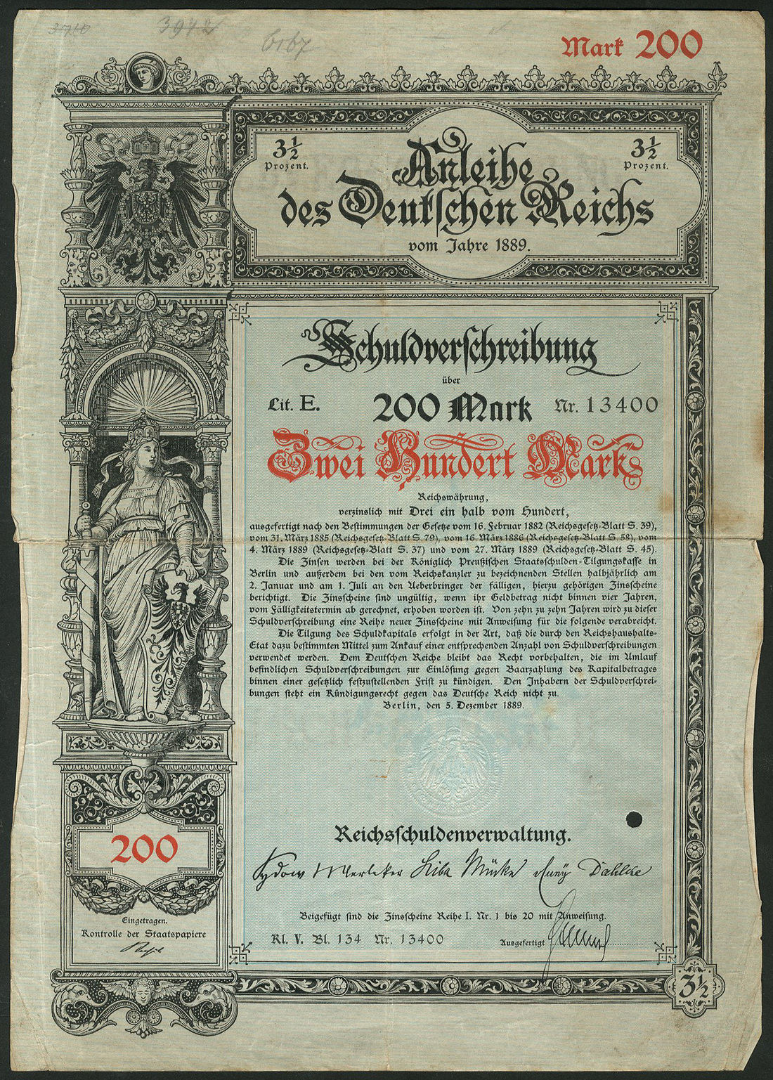 Germania : Anleihe des Deutschen Reichs, a group of 3 Schuldverschreibung, Berlin, comprising 1,000 Mark, 20.6.1878, 200 Mark, 5.12.1889 and 500 Mark, 29.4.1908, very fine. (3 different items)