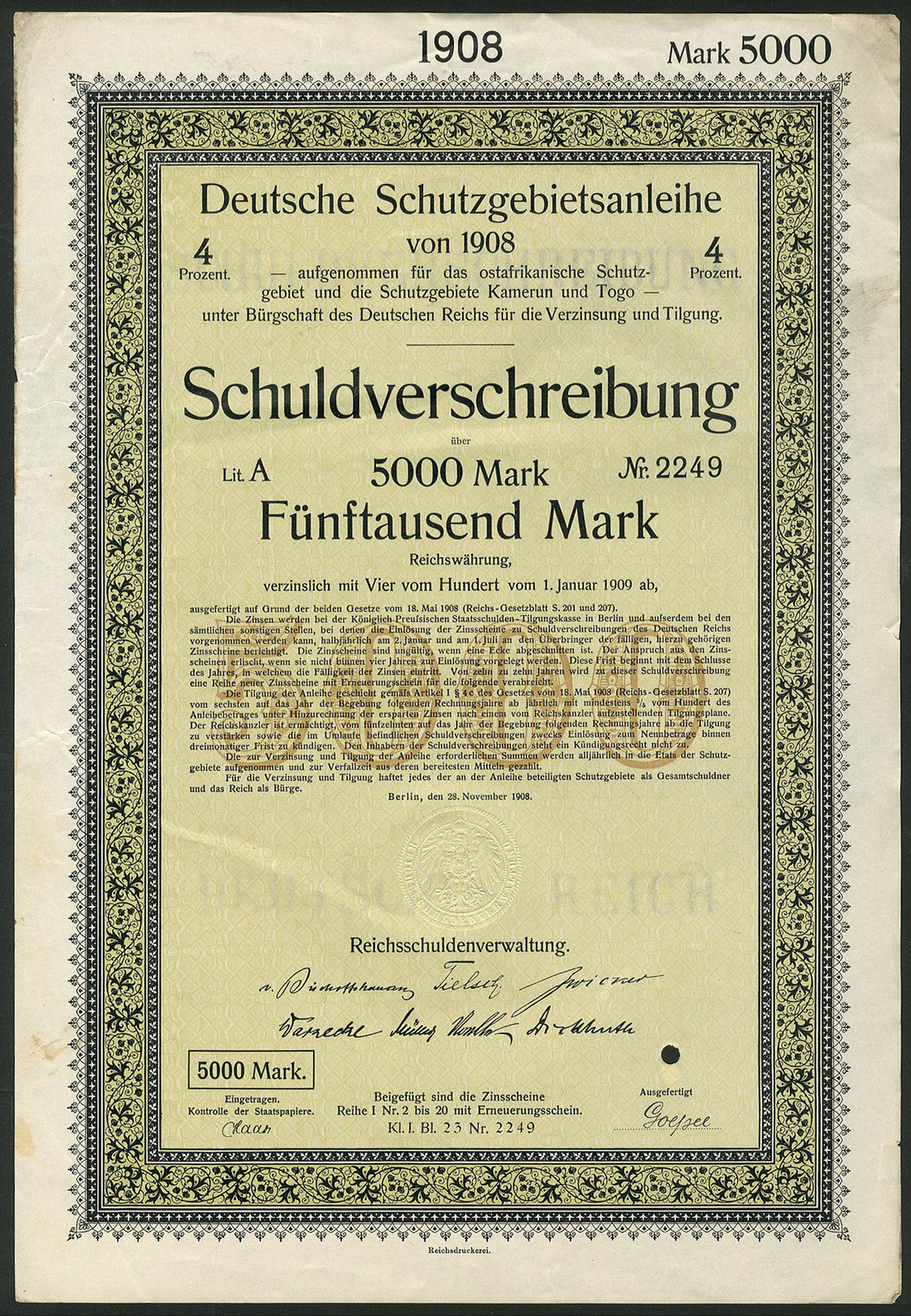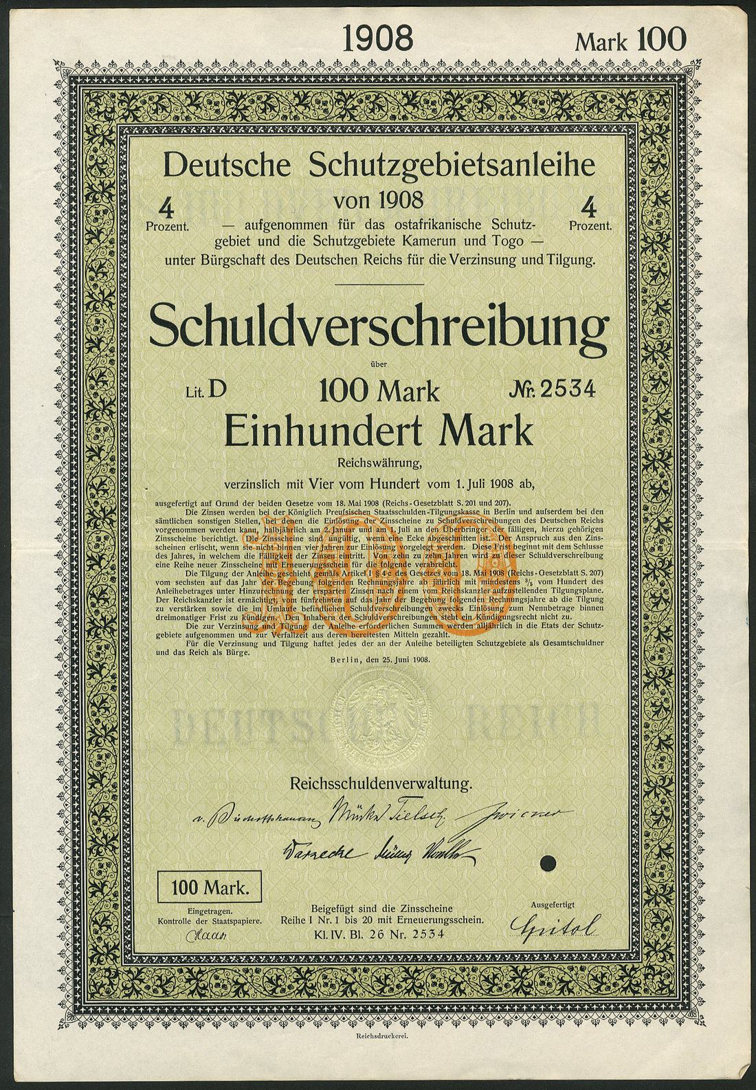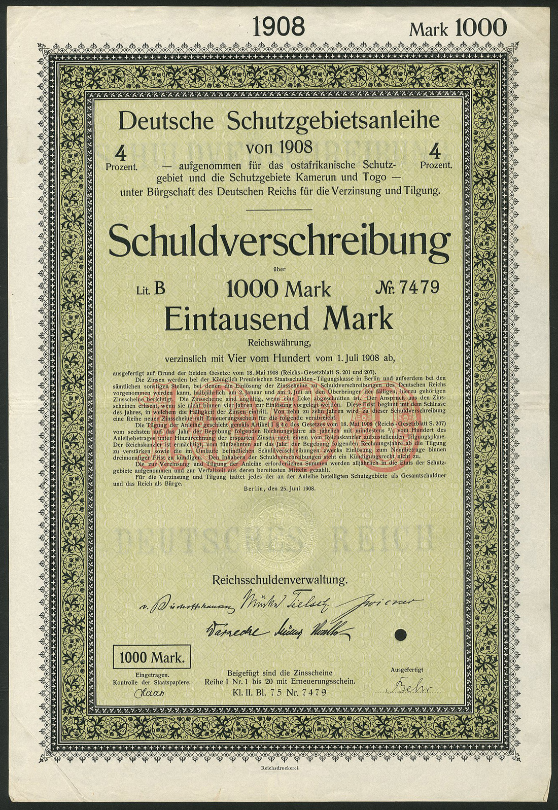 Deutsche Schutzgebietsanleihe / German Protectorates Loan 1908, a group of 141 4% Schuldverschreibung, Berlin 25.6.1908, comprising 100 Mark (49), 500 Mark (36), 1,000 Mark (55) and 5,000 Mark (1), for German-East Africa, Cameroon, Togo and guaranteed by the German Reich, green and yellow with decorative border, generally extremely fine. (141 items)