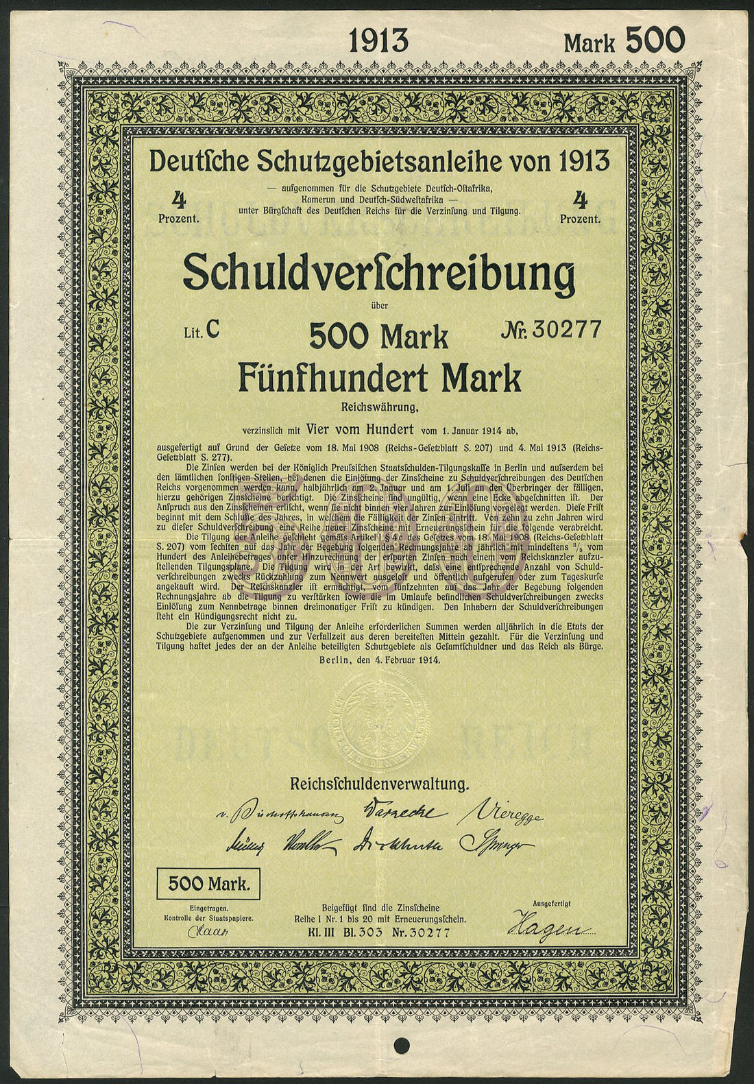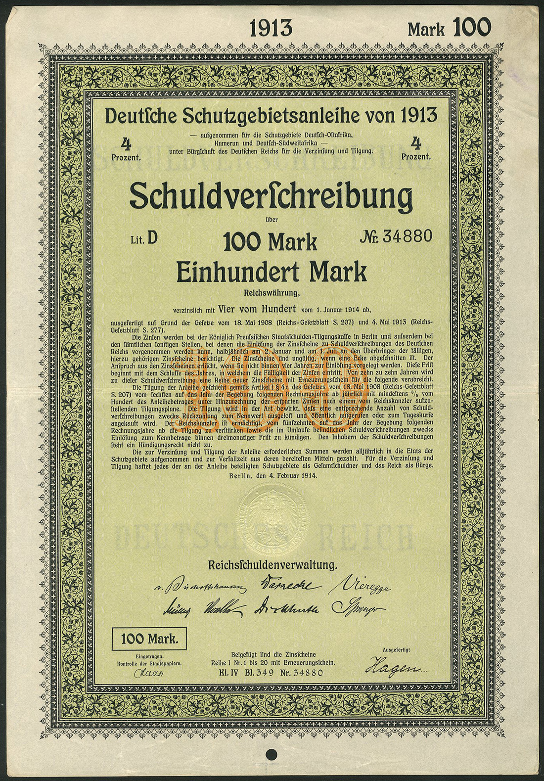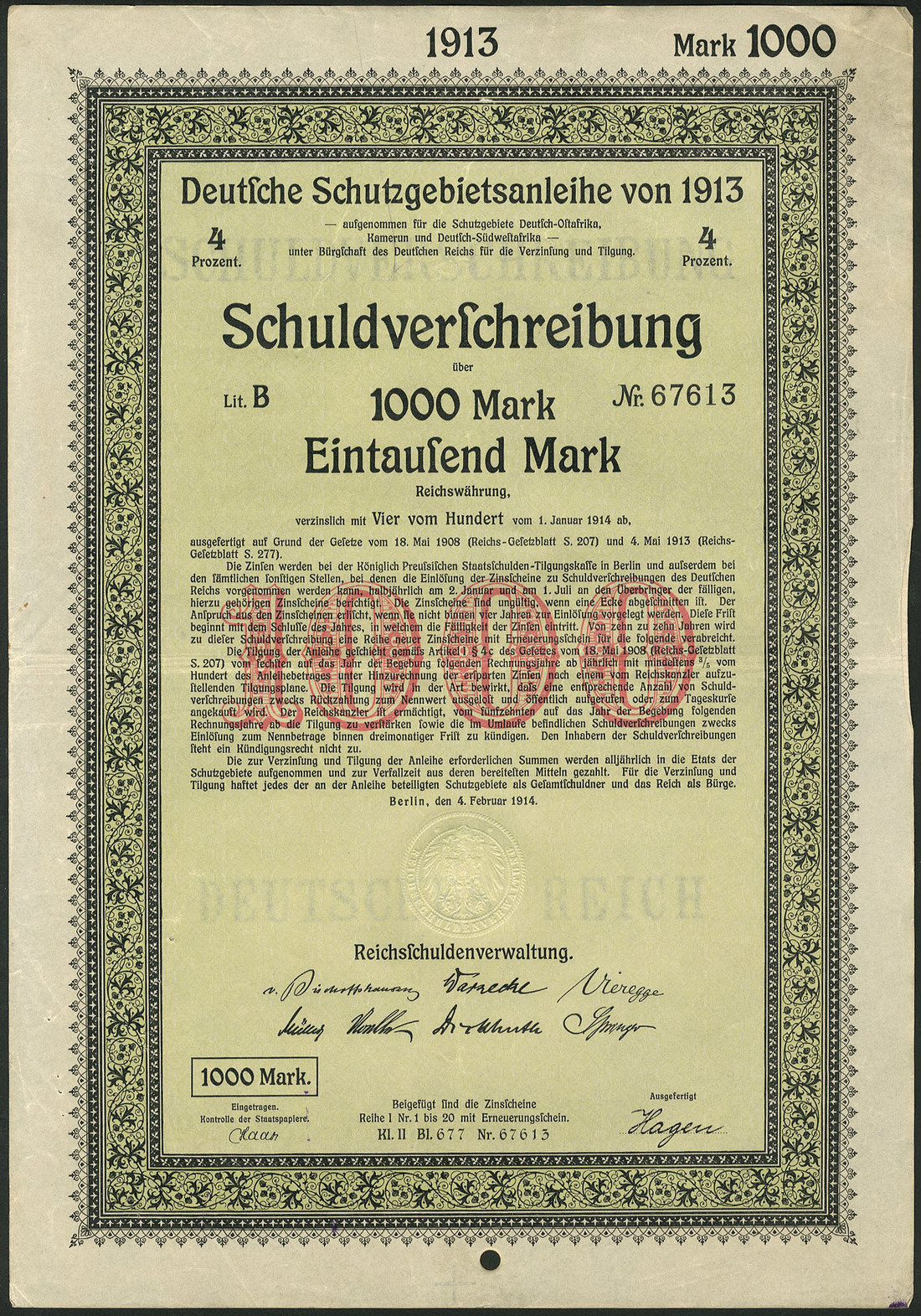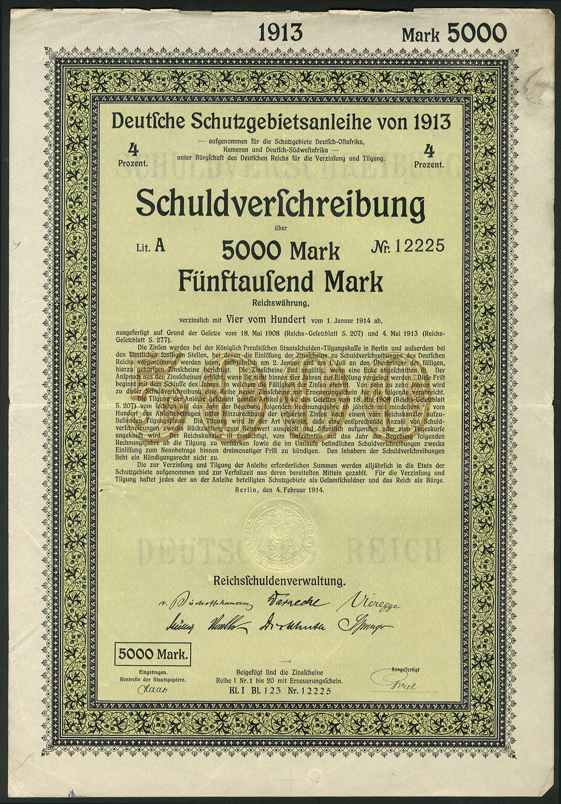 Deutsche Schutzgebietsanleihe / German Protectorates Loan 1913, a group of 155 x 4% Schuldverschreibung, Berlin 4.2.1914, comprising 100 Mark (58), 500 Mark (37), 1,000 Mark (58) and 5,000 Mark (2), issued for German-East Africa, Cameroon & South-West Africa and guaranteed by the German Reich, green and yellow with decorative border, generally extremely fine (155 items)