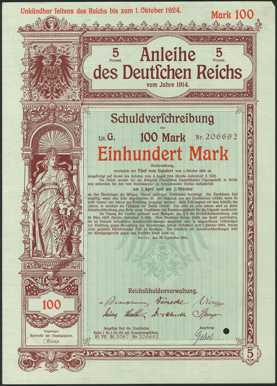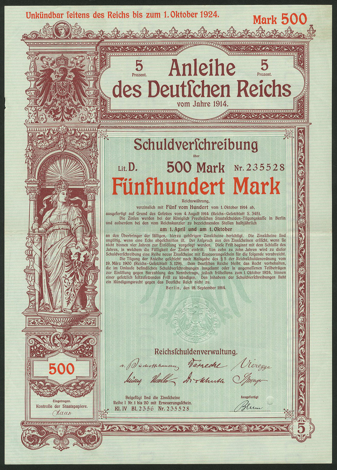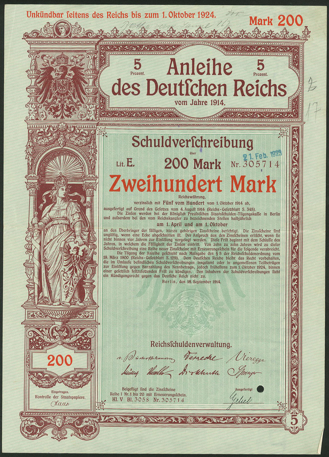 Germania 1914: Anleihe des Deutschen Reichs - Kriegsanleihe / War Loan I Sep, a group of 18 x 5% Schuldverschreibung, Berlin 18.9.1914 comprising 100 Mark (14), 200 Mark (3) and 500 Mark (1), generally extremely fine. (18 items)