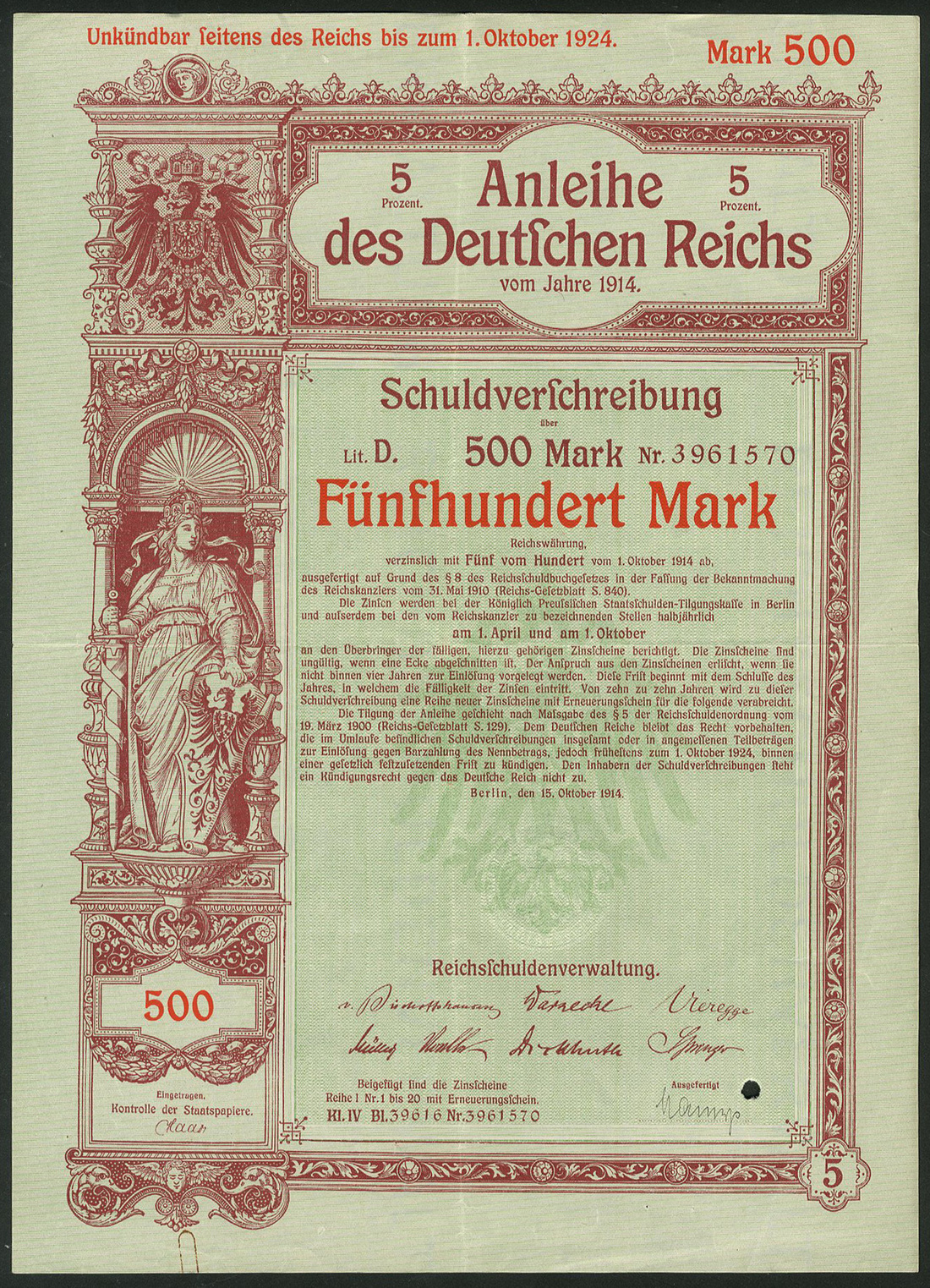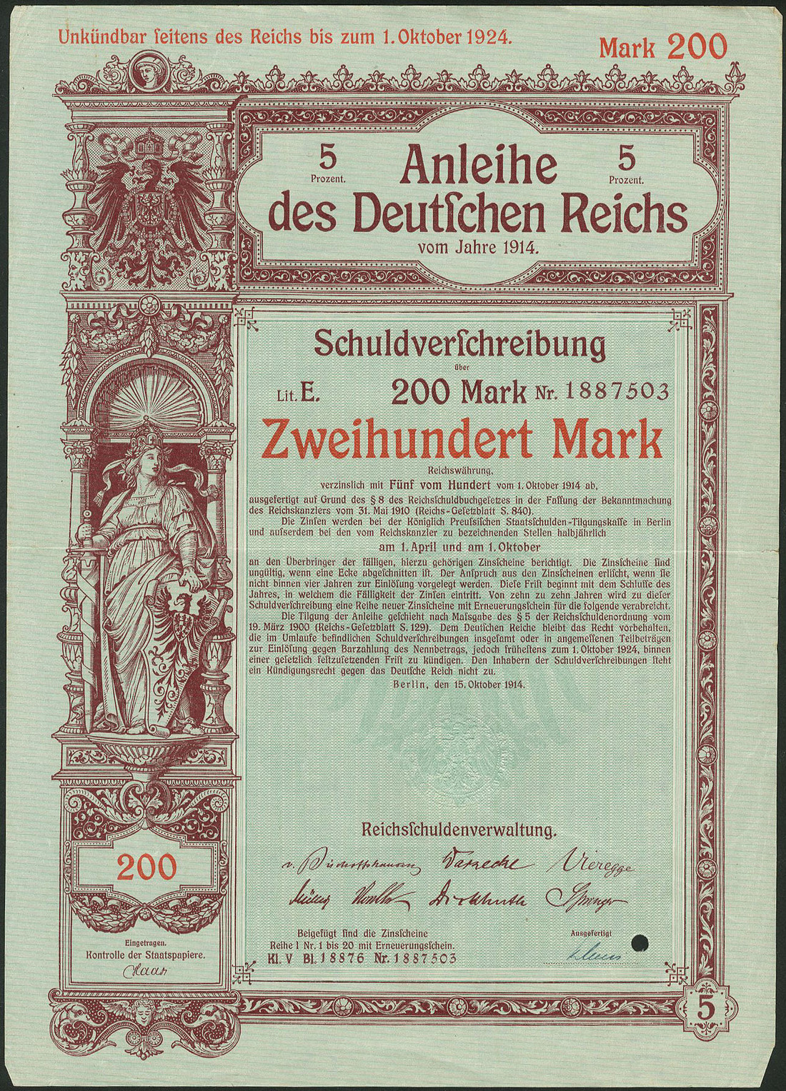Germania 1914: Anleihe des Deutschen Reichs - Kriegsanleihe / War Loan I Oct, a group of 5 x 5% Schuldverschreibung, Berlin 15.10.1914 comprising 100 Mark (1), 200 Mark (3) and 500 Mark (1), generally extremely fine. (5 items)