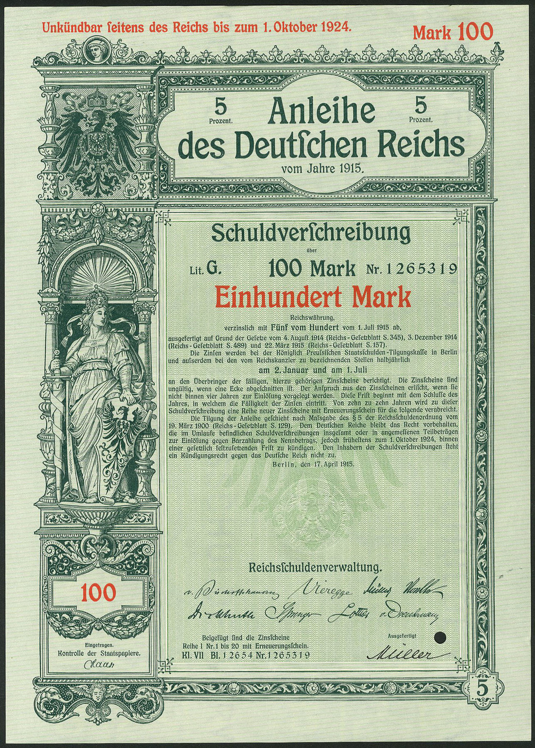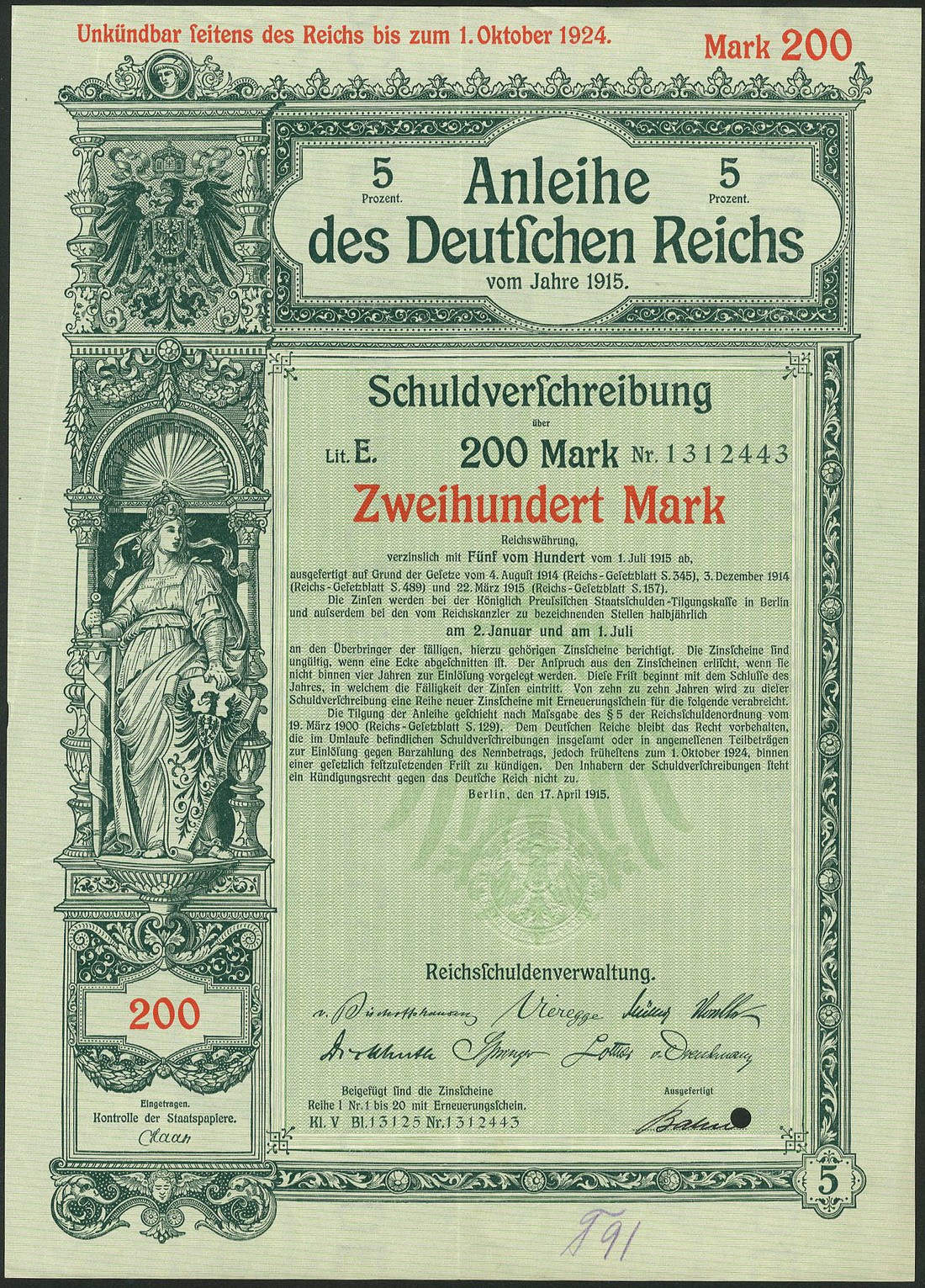 Germania 1915: Anleihe des Deutschen Reichs - Kriegsanleihe / War Loan II Apr, a group of 33 x 5% Schuldverschreibung, Berlin 17.4.1915 comprising 100 Mark (14), 200 Mark (18) and 1,000 Mark (1), generally extremely fine. (33 items)
