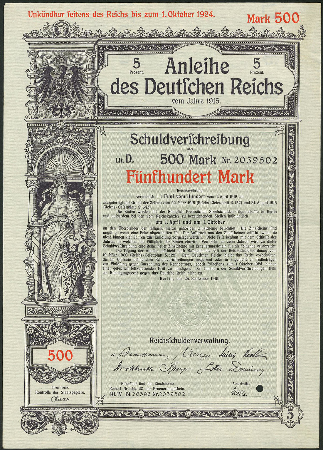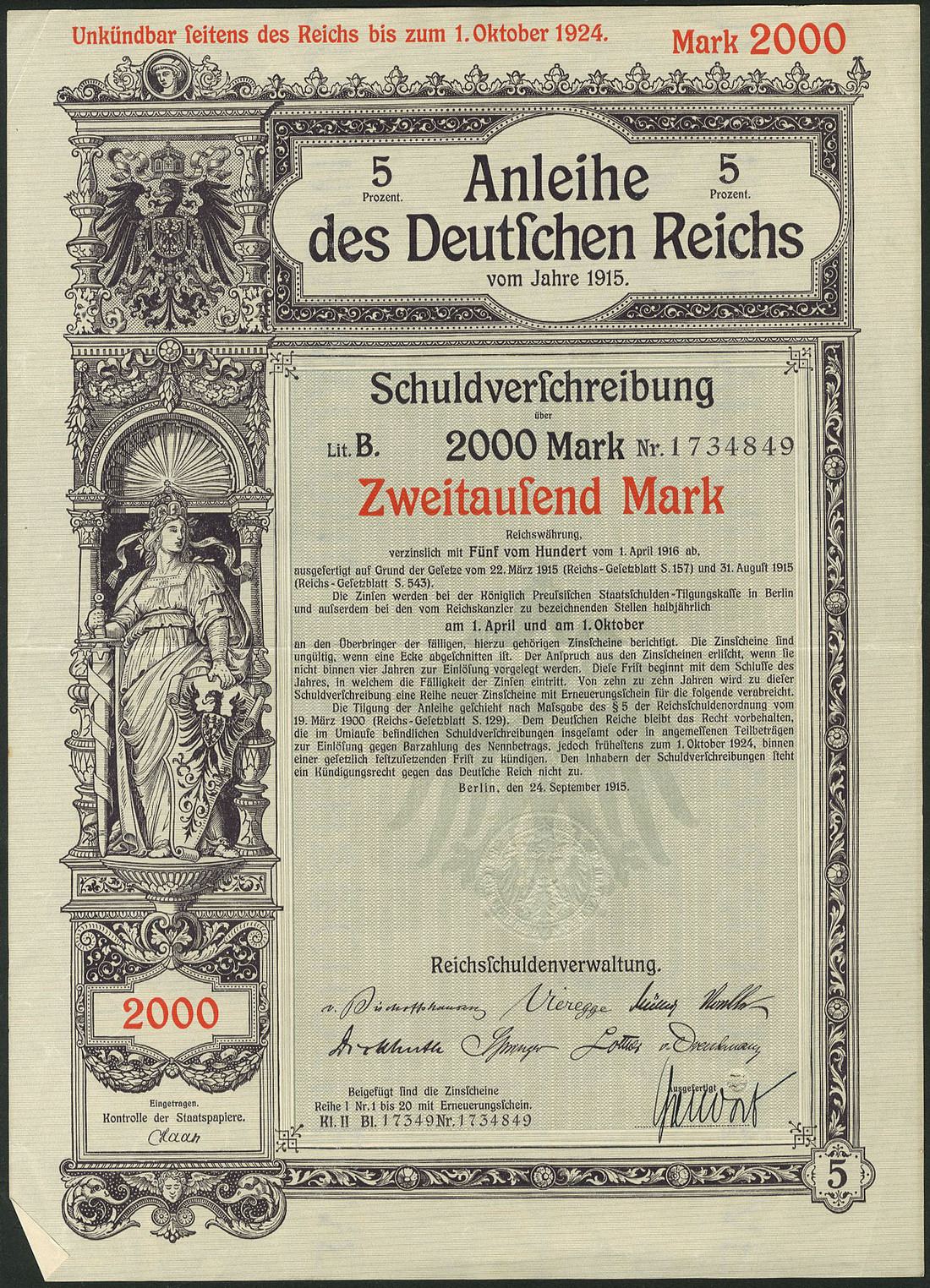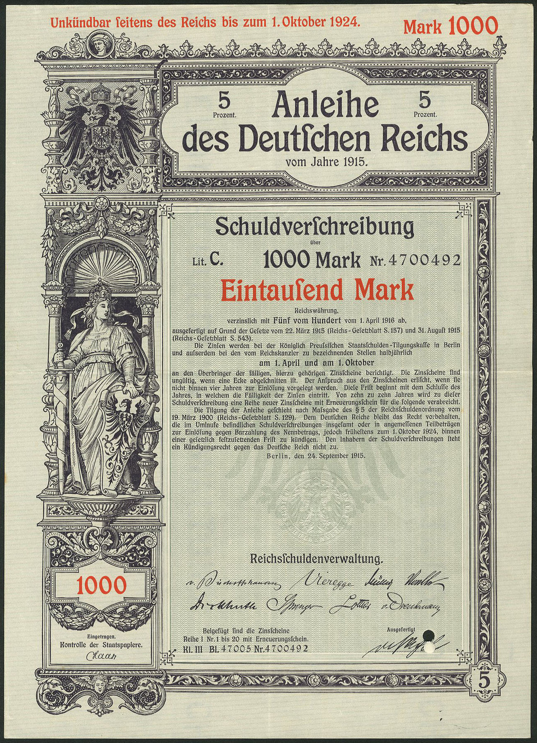 Germania 1915: Anleihe des Deutschen Reichs - Kriegsanleihe / War Loan III, a group of 92 x 5% Schuldverschreibung, Berlin, 24.9.1915 comprising 100 Mark (44), 200 Mark (28), 500 Mark (13), 1,000 Mark (4), 2,000 Mark (1) and 5'000 Mark (2), generally extremely fine. (92 items)