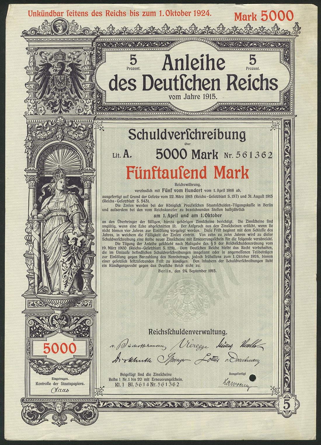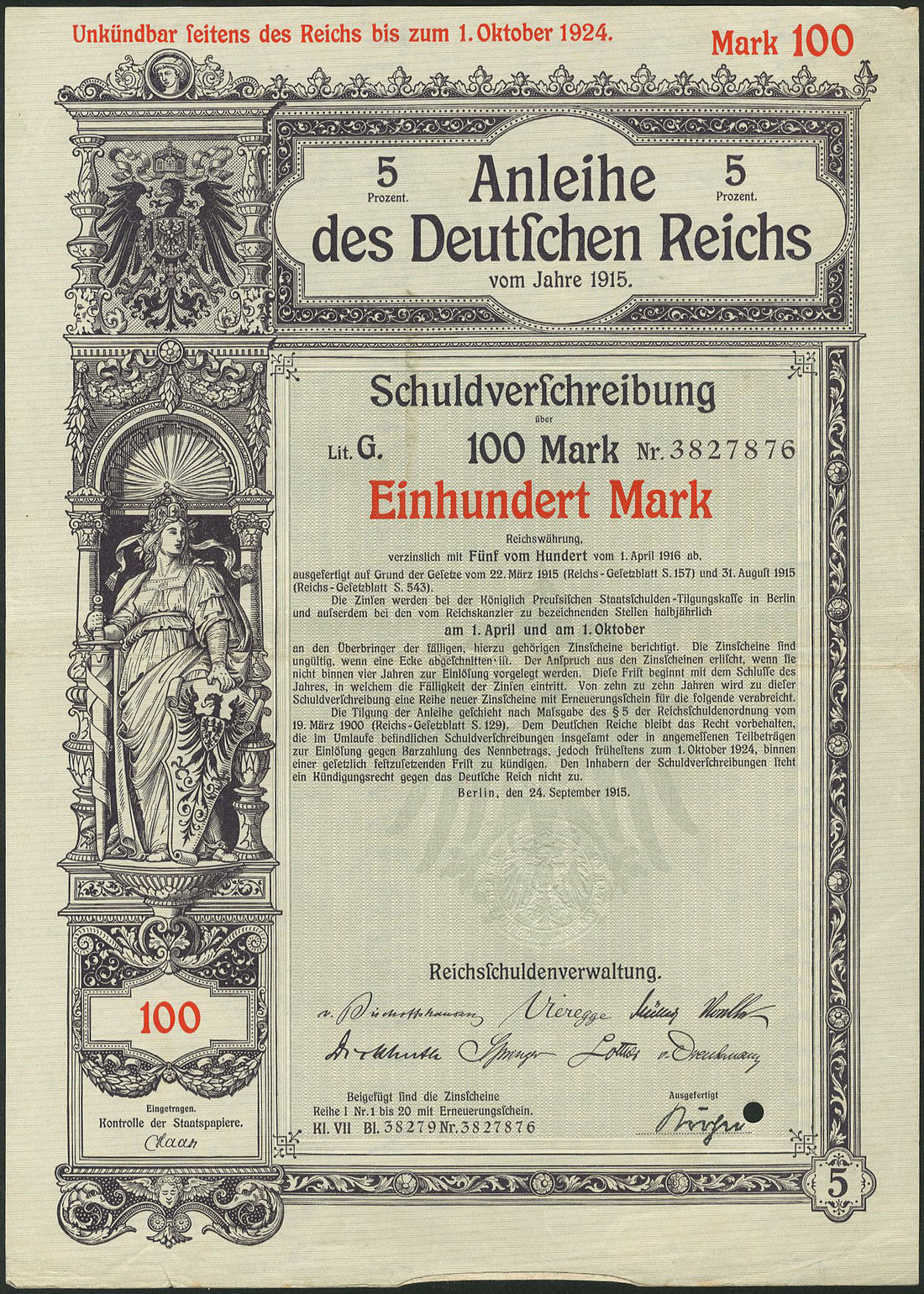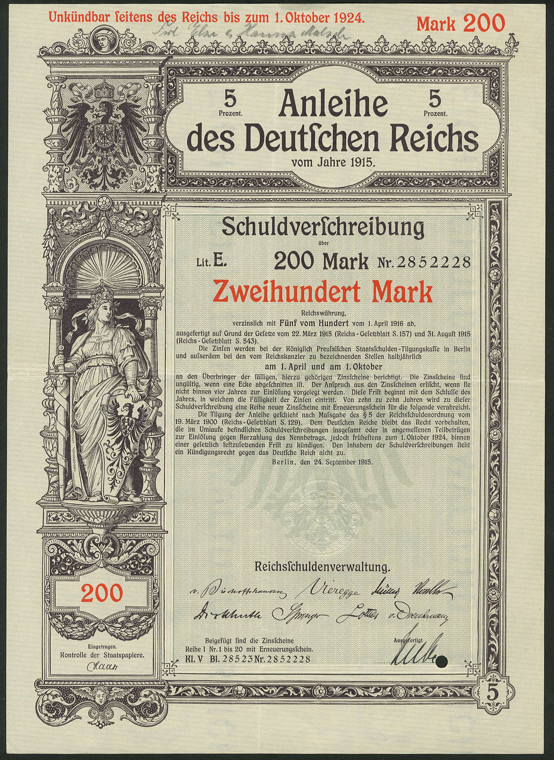 Germania 1915: Anleihe des Deutschen Reichs - Kriegsanleihe / War Loan III, a group of 92 x 5% Schuldverschreibung, Berlin, 24.9.1915 comprising 100 Mark (44), 200 Mark (28), 500 Mark (13), 1,000 Mark (4), 2,000 Mark (1) and 5'000 Mark (2), generally extremely fine. (92 items)