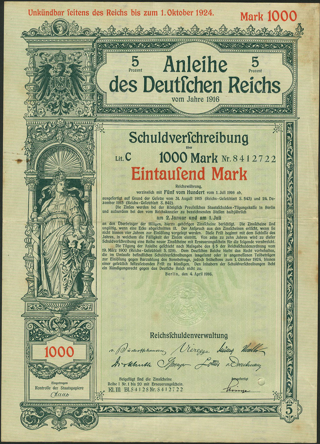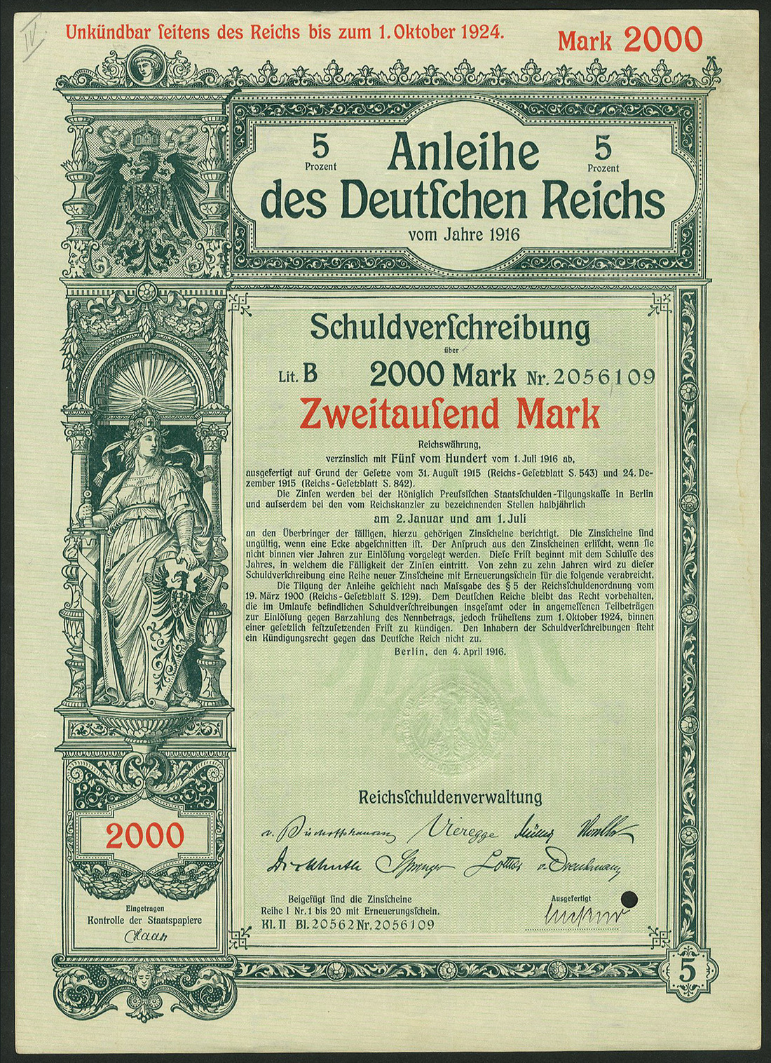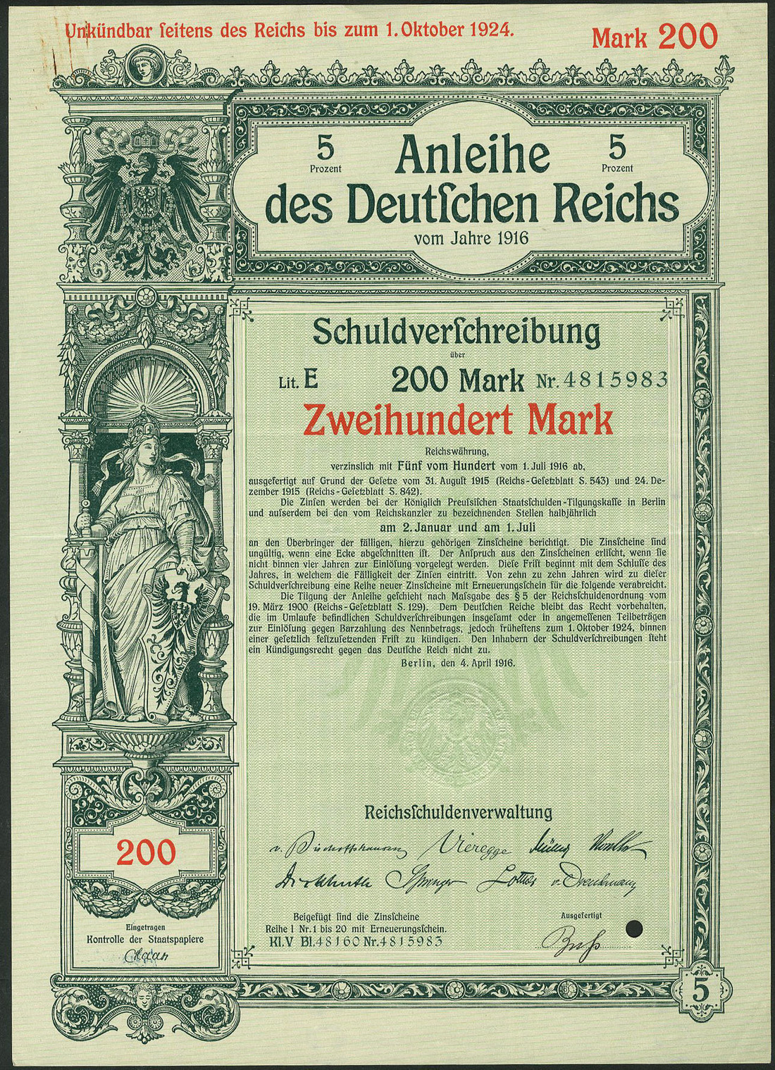 Germania 1916: Anleihe des Deutschen Reichs - Kriegsanleihe / War Loan IV, a group of 74 x 5% Schuldverschreibung, Berlin 4.4.1916 comprising 200 Mark (57), 1,000 Mark (1) and 2,000 Mark (16), generally extremely fine. (74 items)