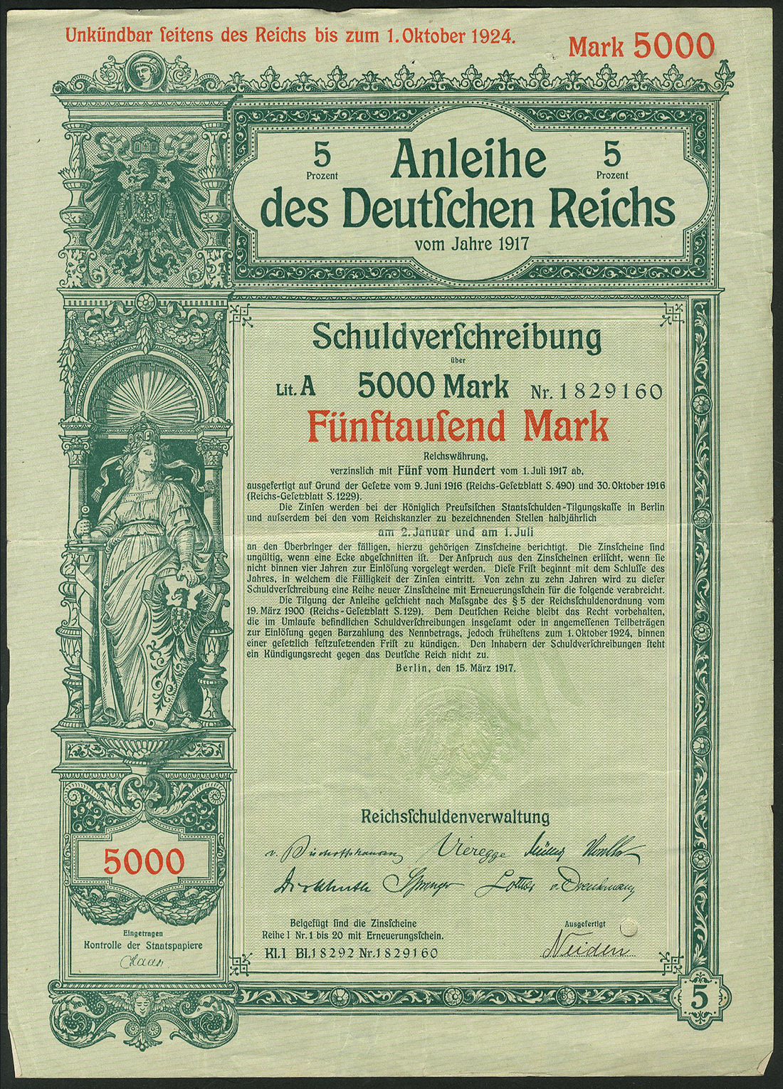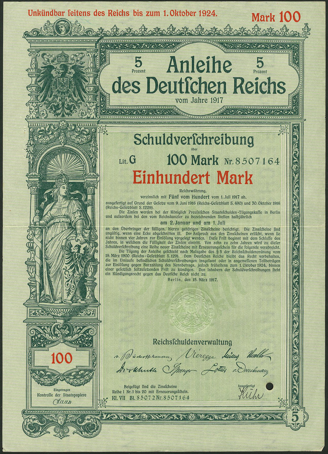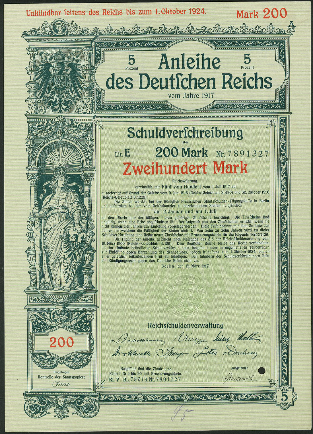 Germania 1917: Anleihe des Deutschen Reichs - Kriegsanleihe / War Loan VI, a group of 134 x 5% Schuldverschreibung, Berlin 15.3.1917 comprising 100 Mark (98), 200 Mark (35) and 5,000 Mark (1), generally extremely fine. (134 items)