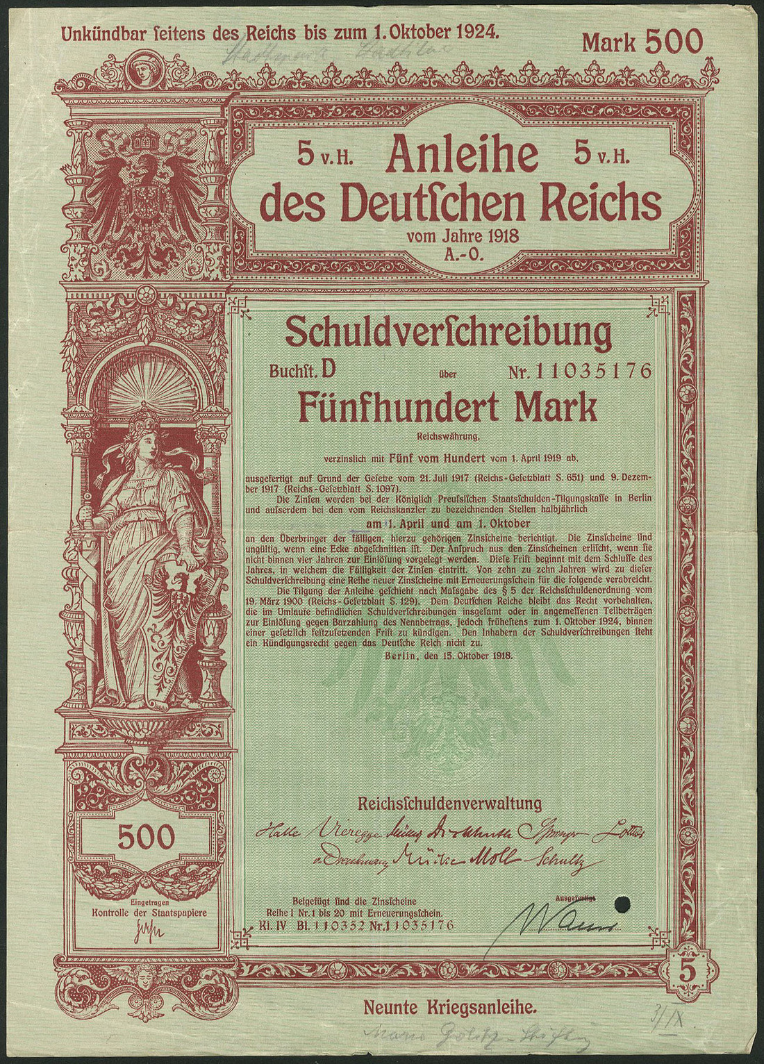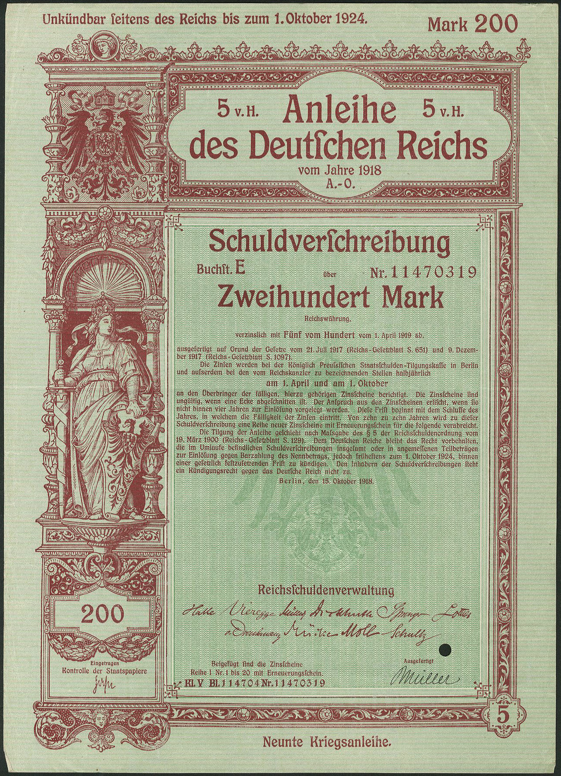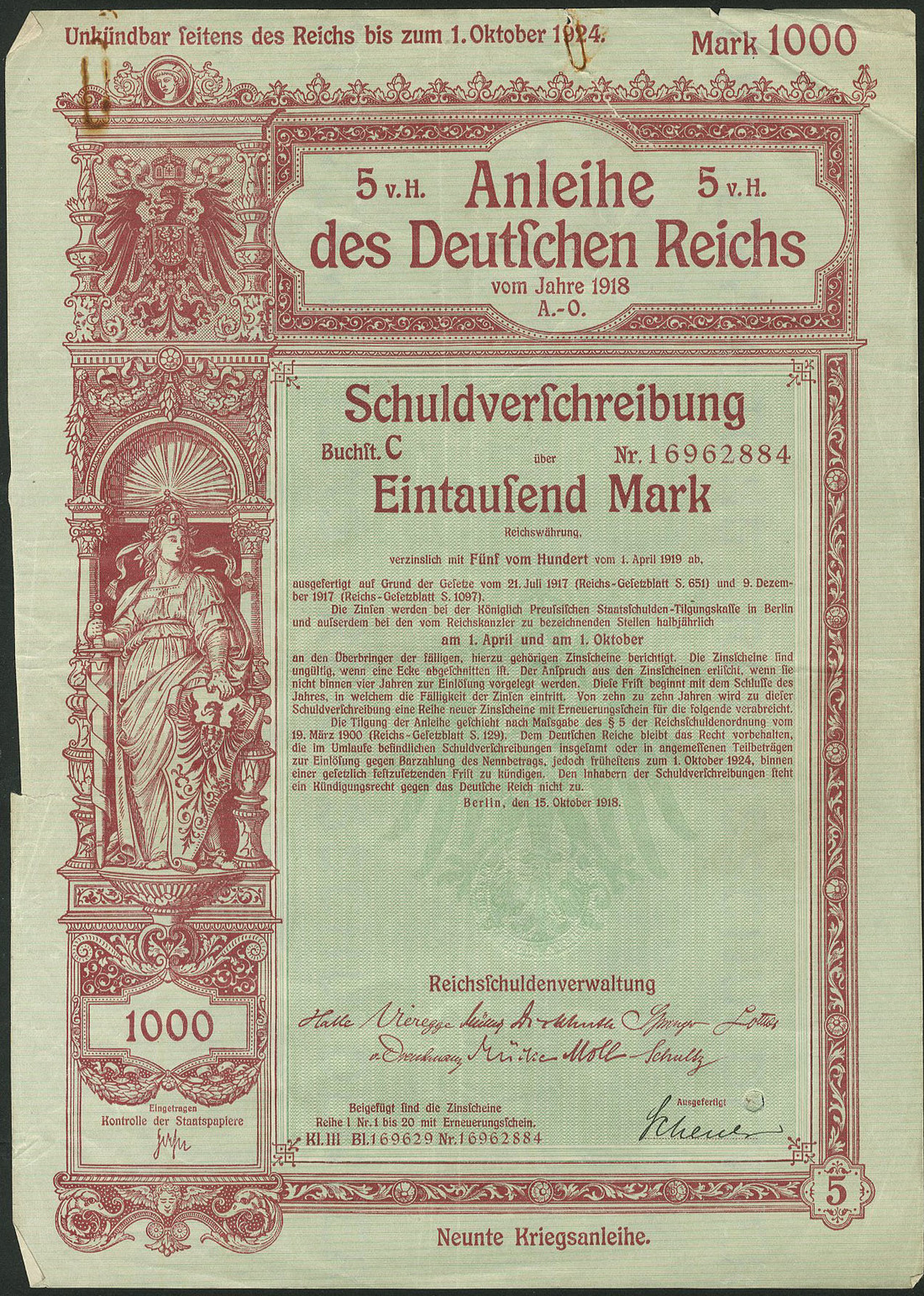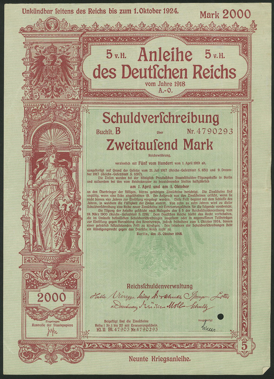 Germania 1918: Anleihe des Deutschen Reichs - Kriegsanleihe / War Loan IX, a group of 16 x 5% Schuldverschreibung, Berlin 15.10.1918 comprising 200 Mark (7), 500 Mark (1), 1,000 Mark (1) and 2,000 Mark (7), generally extremely fine. (16 items)