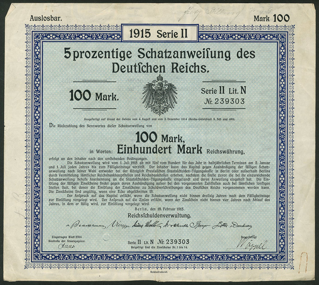 5 Prozentige Schatzanweisung / Treasury Bill des Deutschen Reichs 1915, 100 Mark, Serie II, Berlin 18.2.1915, extremely fine.