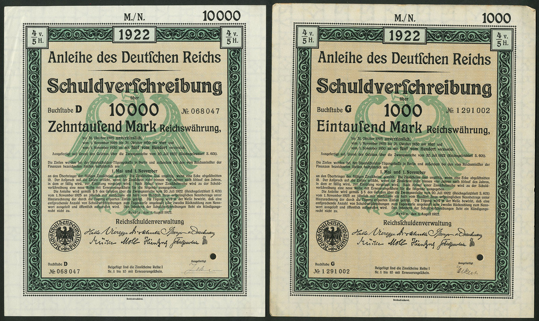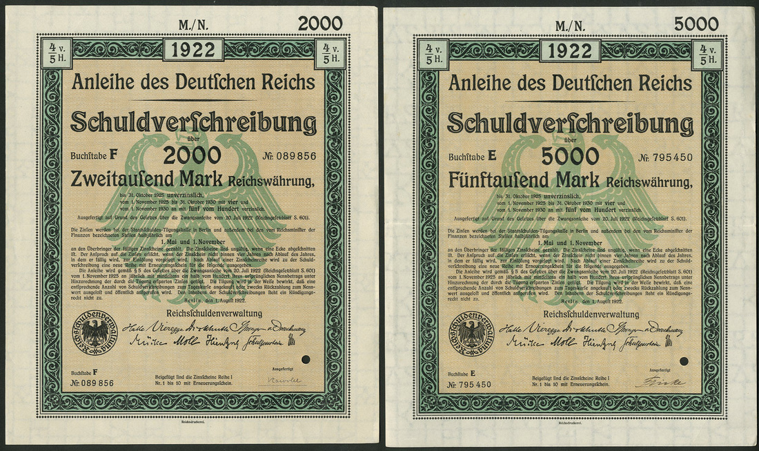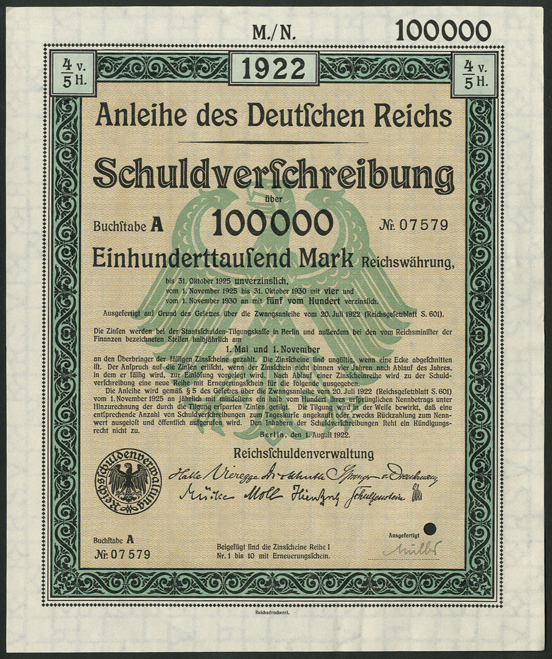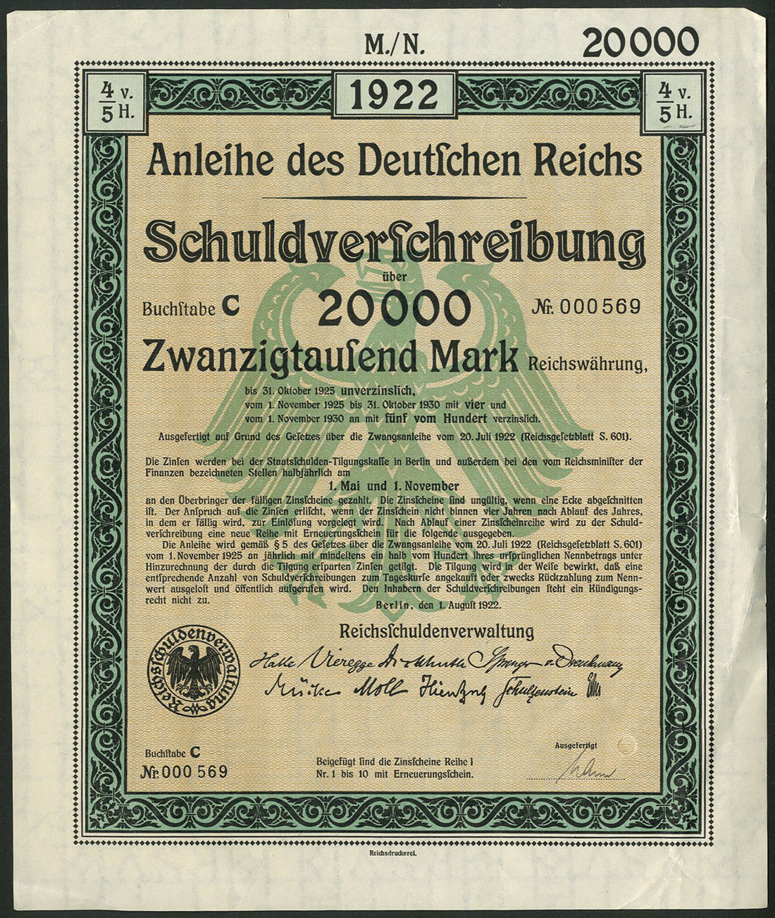 Anleihe des Deutschen Reichs 1922 - Zwangsanleihe 1. Ausgabe / Forced Loan 1. Issue, a complete set of 2416 x 4½% Schuldverschreibung, Berlin 1.8.1922 comprising 100,000 RM (21), 50,000 RM (134), 20,000 RM (1), 10,000 RM (912), 5,000 RM (356), 2,000 (211), 1,000 (781), generally extremely fine. (2416 items)