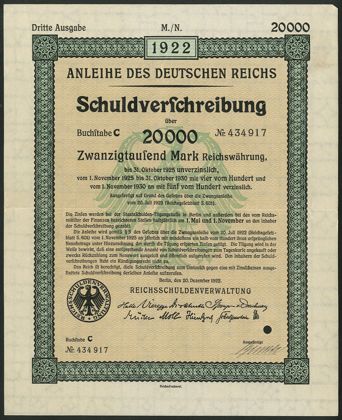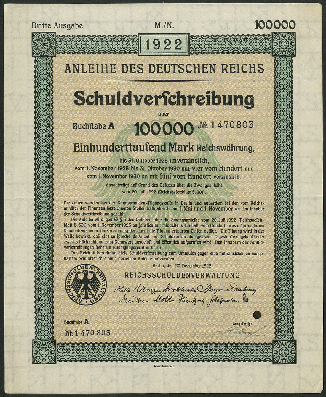 Anleihe des Deutschen Reichs 1922 - Zwangsanleihe 3. Ausgabe / Forced Loan 3. Issue, a complete set of 1342 x 4½% Schuldverschreibung, Berlin 20.12.1922 comprising 100,000 RM (331), 50,000 RM (129), 20,000 RM (17), 10,000 RM (253), 5,000 RM (83), 2,000 RM (281), 1,000 RM (248), generally extremely fine. (1342 items)