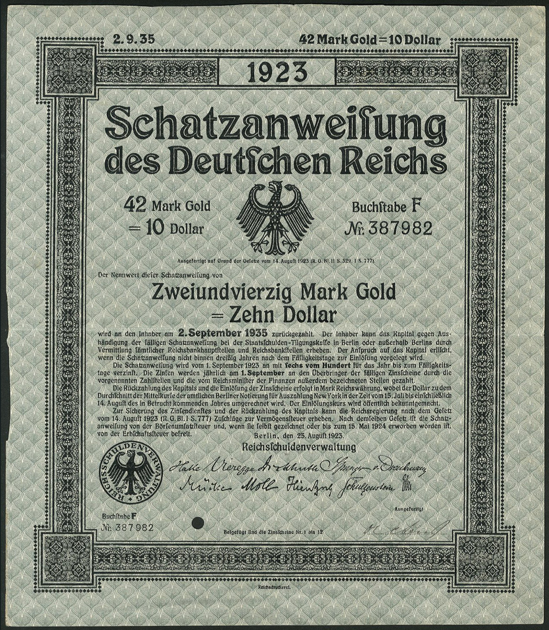 Schatzanweisung des Deutschen Reichs / Treasury Bill 1923, a group of 16 x "42 Mark Gold = 10 Dollar", Berlin 25.8.1923, very rare, generally extremely fine. (16 items)