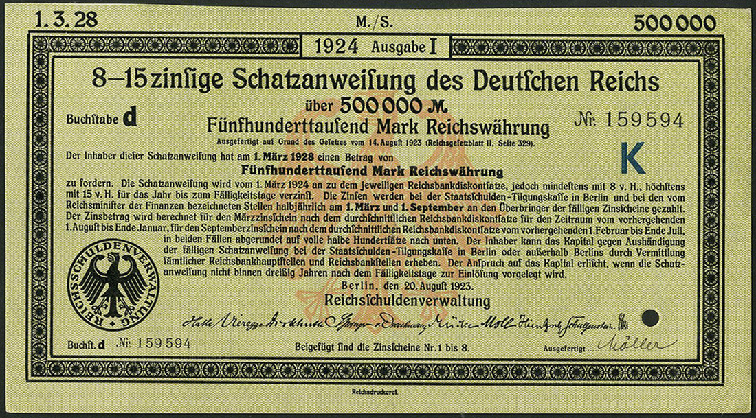 8-15 zinsige Schatzanweisung des Deutschen Reichs / Treasury Bill 1923, a group of 97 x 500,000 Mark, d, Berlin 20.10.1923, generally extremely fine. (97 items)