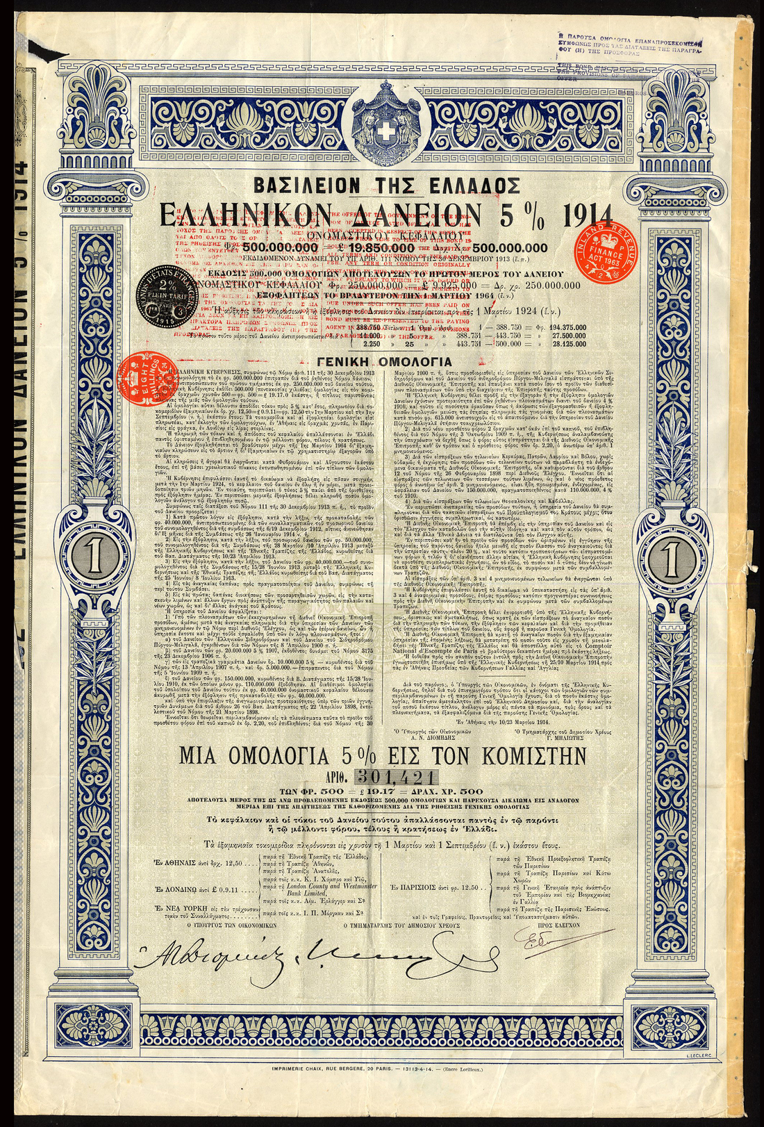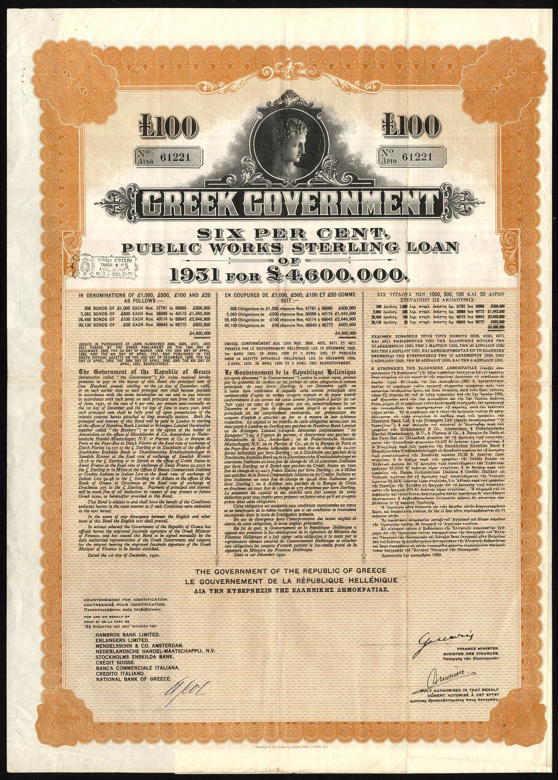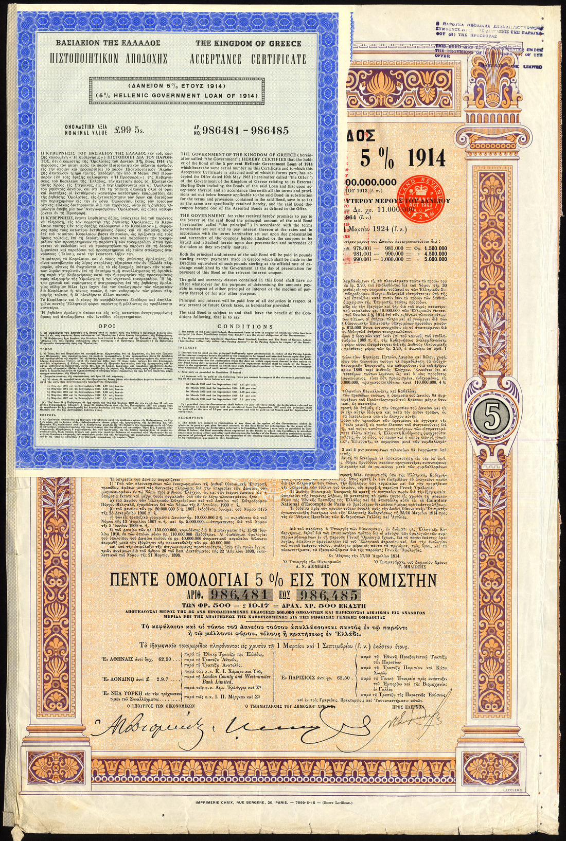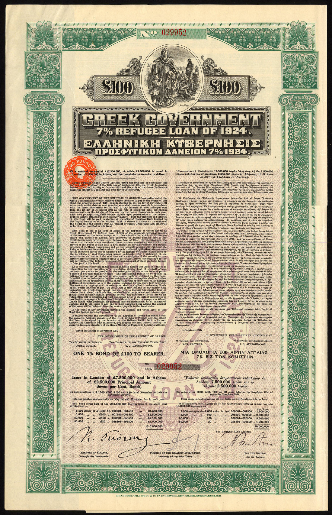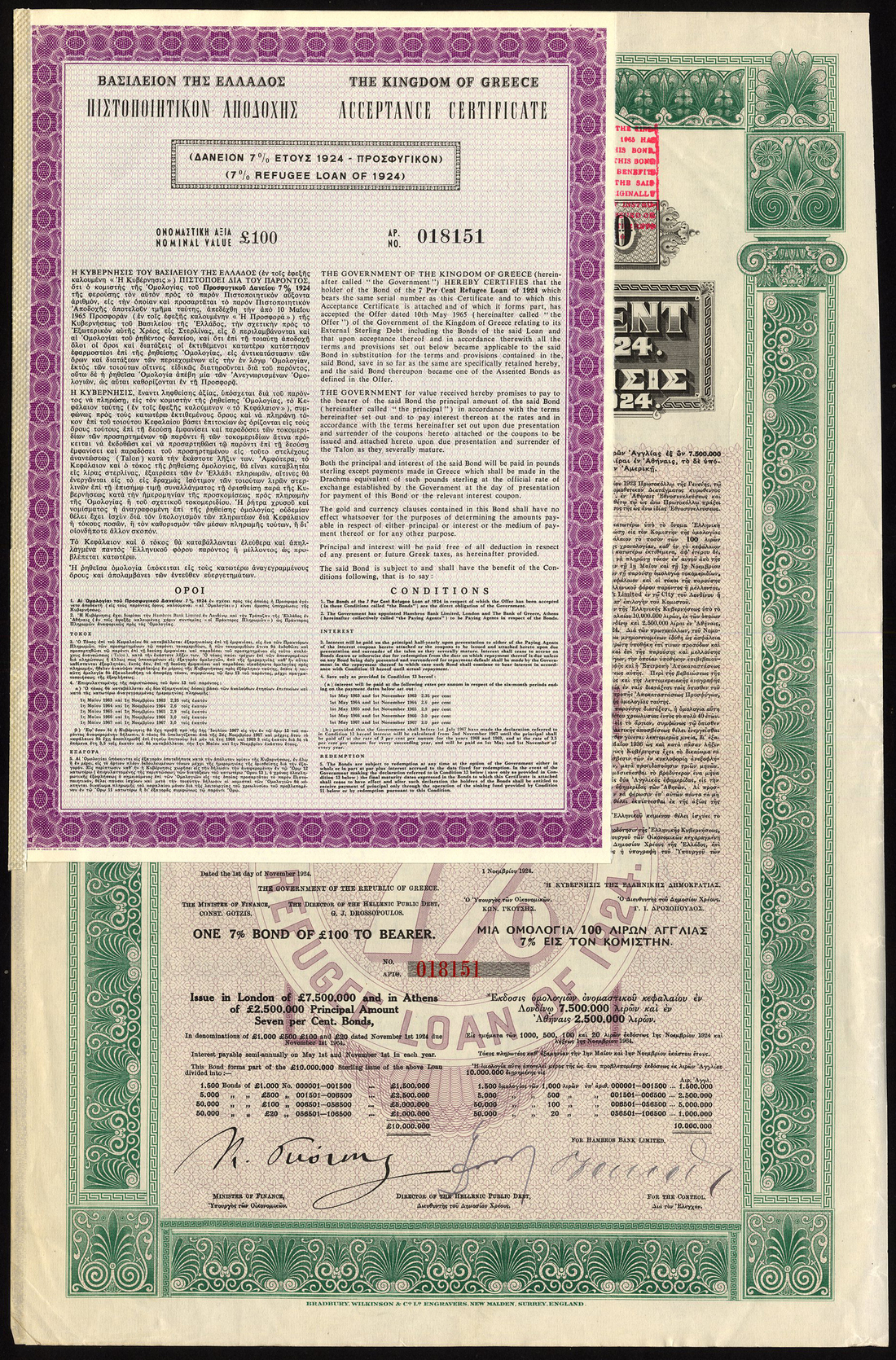Greece: Hellenic Government 5% Loan of 1914 bonds for 500 francs (2) and 2500 francs (3), large format with ornate border, text in Greek with French and English on reverse, all with 1963 Acceptance Certificate attached which was exchanged for the coupon sheets, 1924 7% Refugee Loan, bonds for £100 (3), one with 1963 Acceptance Certificate attached issued in exchange for coupon sheet, refugees at top, green, and 6% Public Works Sterling Loan, 1931, bond for £100, very large format, classical head at top, ornate border, text in English, French and Greek, orange-brown, with coupons, generally very fine and better. (9)