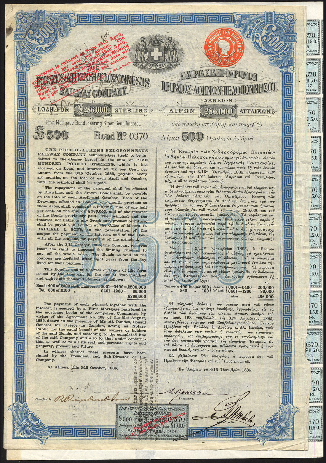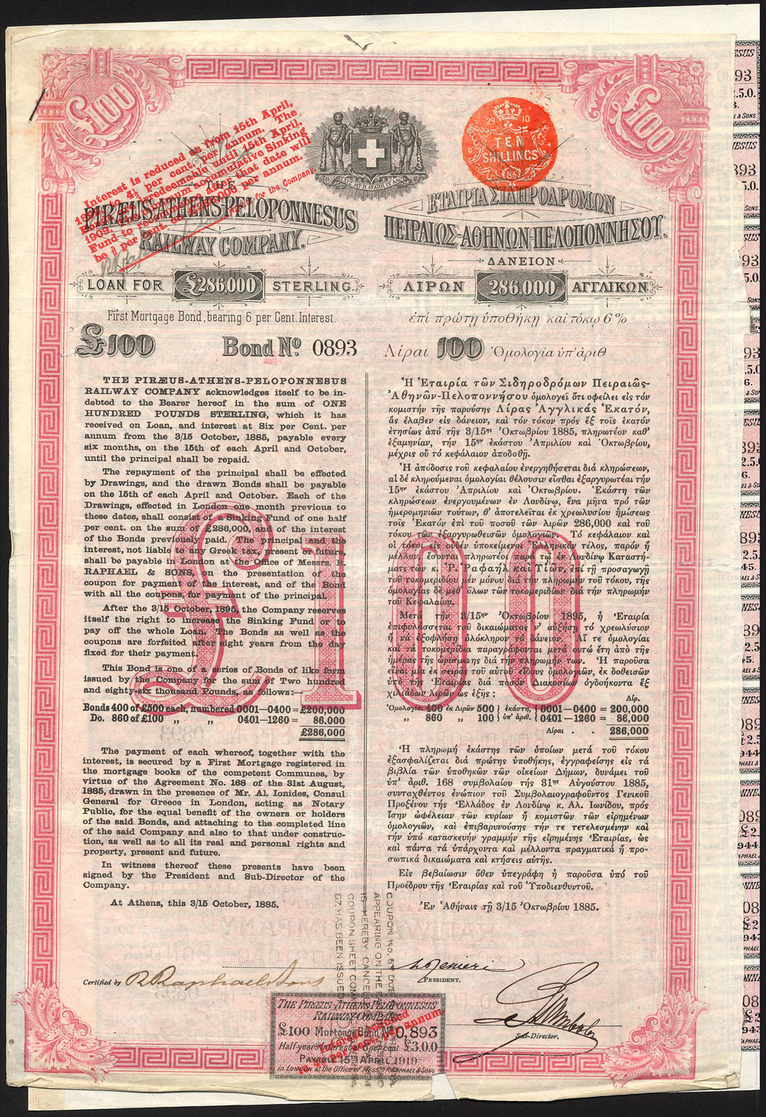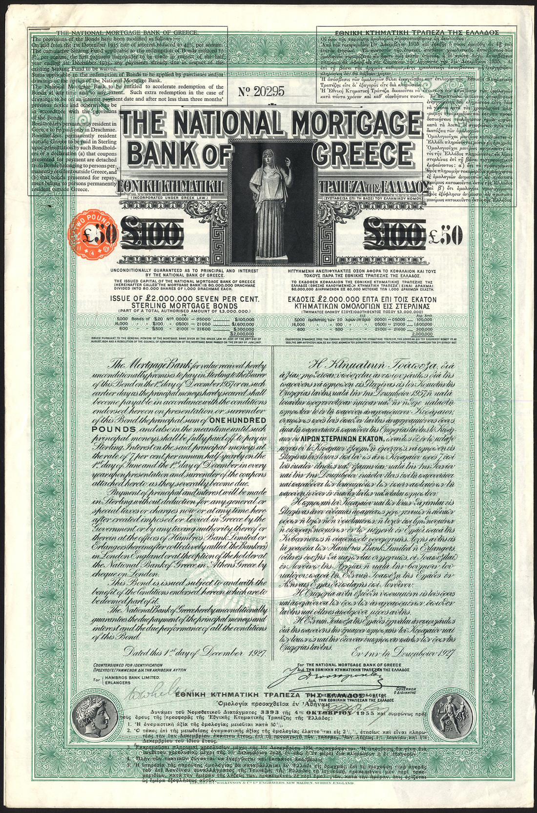 Greece: National Mortgage Bank of Greece, 7% sterling mortgage bonds comprising £100, reduced to £50, 1927, no.20295, £100, 1927, no.13760 and £100, 1928, no.25711, all with goddess at top, obverse and reverse of ancient Greek coin in bottom corners, green and black, printed by Bradbury, Wilkinson & Co., endorsed on face; together with Piraeus-Athens-Peloponnesus Railway Co., First Mortgage 6% bonds for £100 (2) and £500 (2), 1885, arms at top, red and blue respectively, mostly very fine or better. (7)