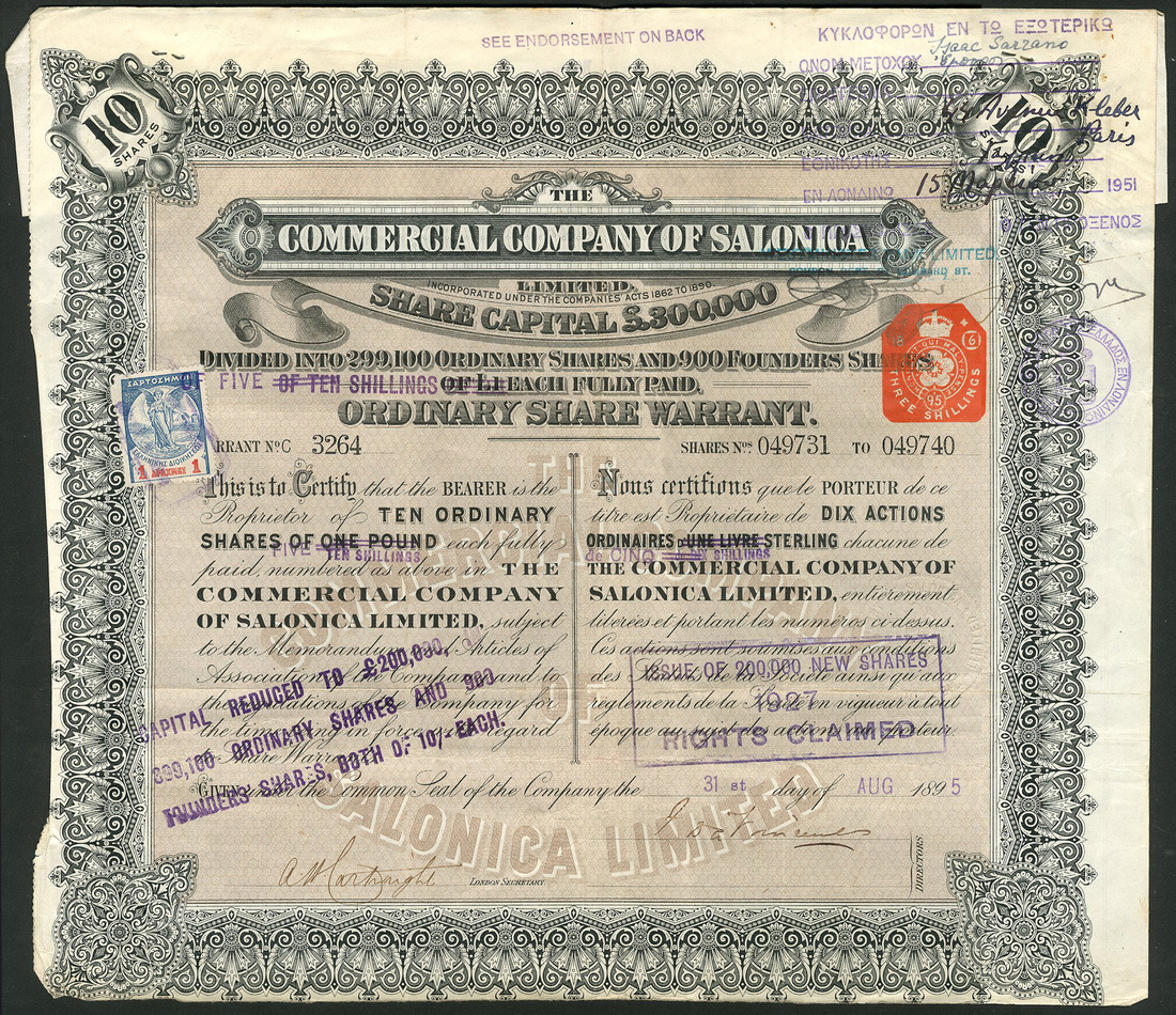 Greece: Commercial Company of Salonica Ltd., a group of 10 bearer warrants for 10 shares of £1, 189(5), value of shares reduced to 10 shillings by overstamp, ornate border, black, blue underprint, printed by Bradbury, Wilkinson & Co., text in English and French, overprints refer to repayment of capital, Greek and English duty stamps, with coupons, generally very fine. (10)