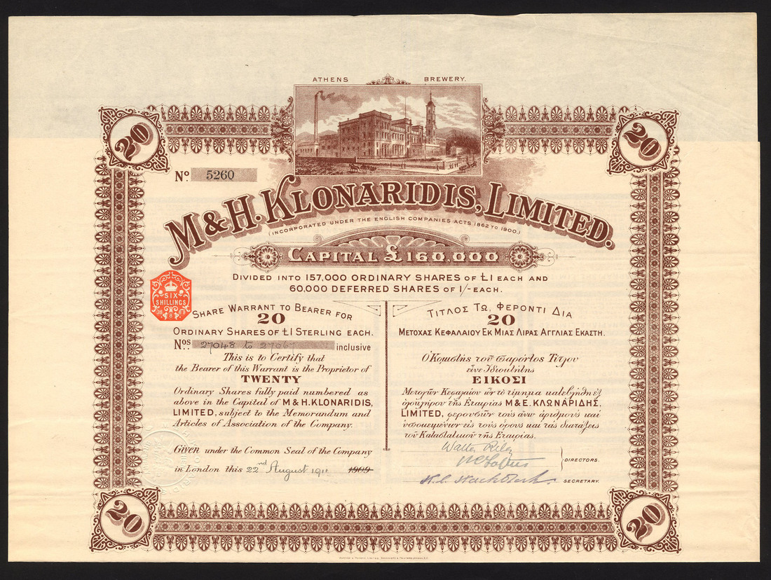 Greece: M & H. Klonaridis Ltd., a bearer certificate for 20 shares of £1, London 1909[1911], no.5260, a large format piece with attractive vignette of the Athens Brewery top centre, brown, text in English and Greek, with coupons, very fine to extremely fine.