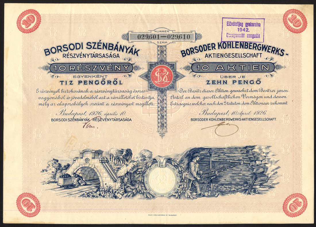 Hungary: Borsoder Kohlenbergwerks A.G. (Borsod Coal Mine), certificate for 10 shares of 10 pengo each, Budapest 1926, no.29601-10, vignettes at bottom depicting entrance to coal mine and worker drilling, embossed seal bottom centre, blue with pink underprint, text in Hungarian and German, with 2 coupons (detached), light creasing, about very fine.
