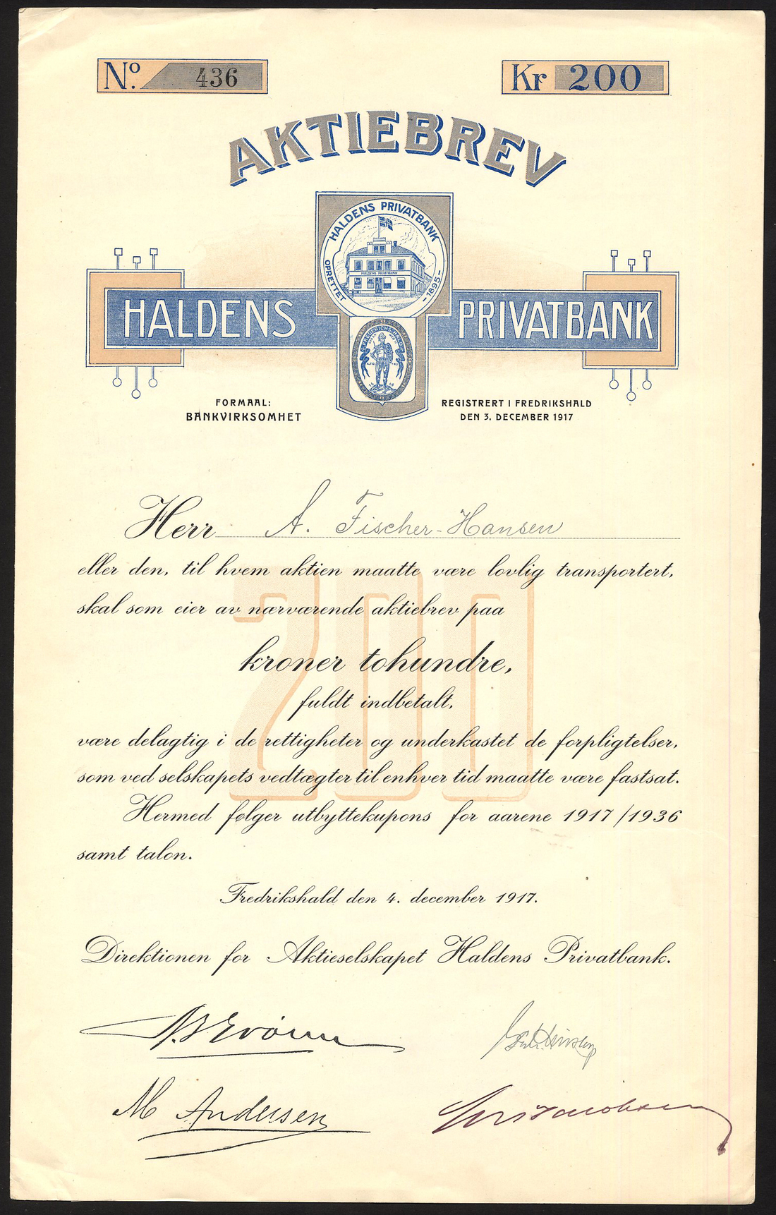 (x) Norway: Haldens Privatbank, 200 krone share, Halden 1917, no.436, bank building within title, black, blue and gold, with coupons, extremely fine.