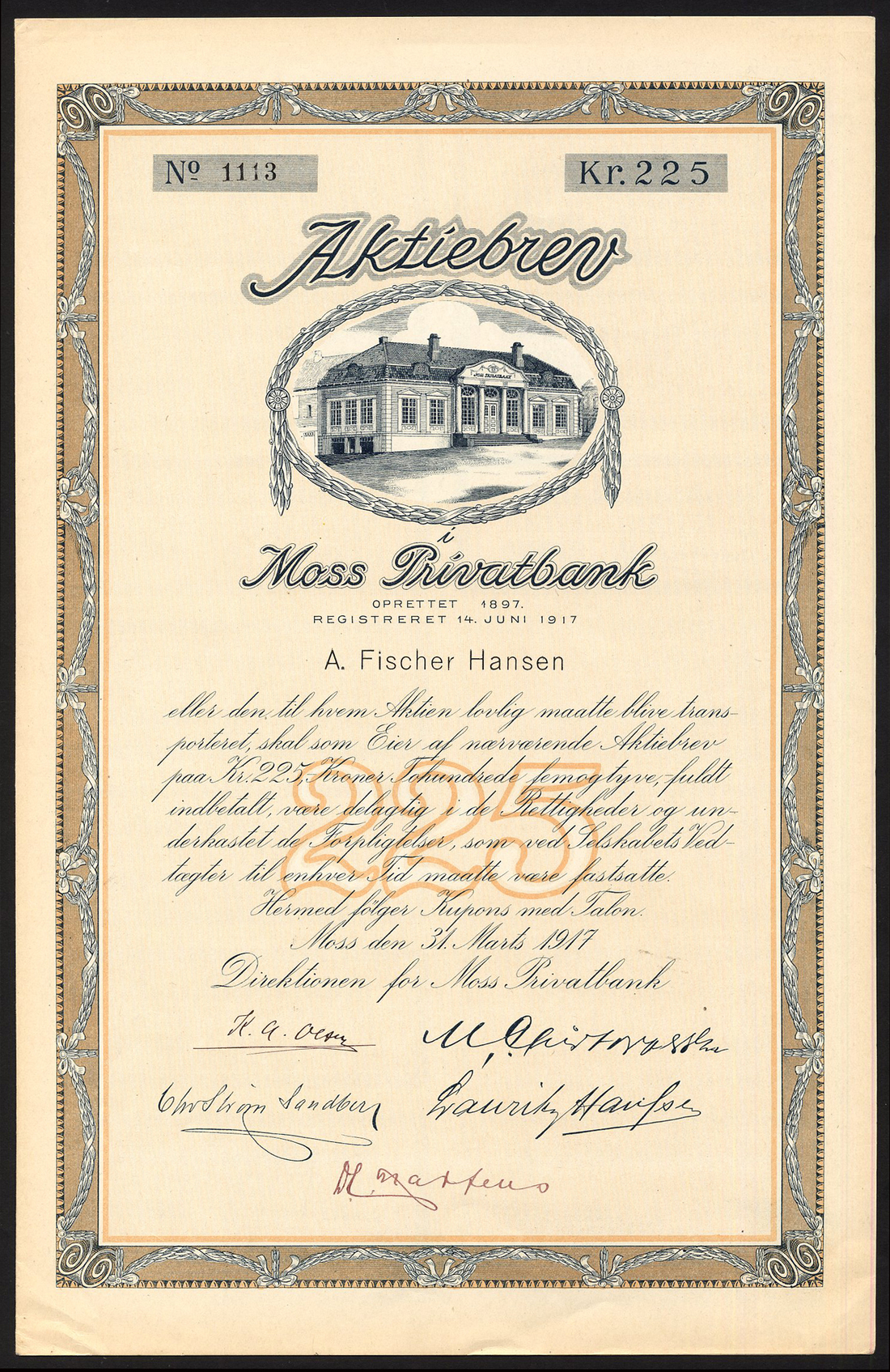 (x) Norway: Moss Privatbank, 225 krone share, Moss 1917, no.1113, vignette of Bank building at top, ornate border, underprinted '225', blue-black and gold, with coupons, extremely fine.