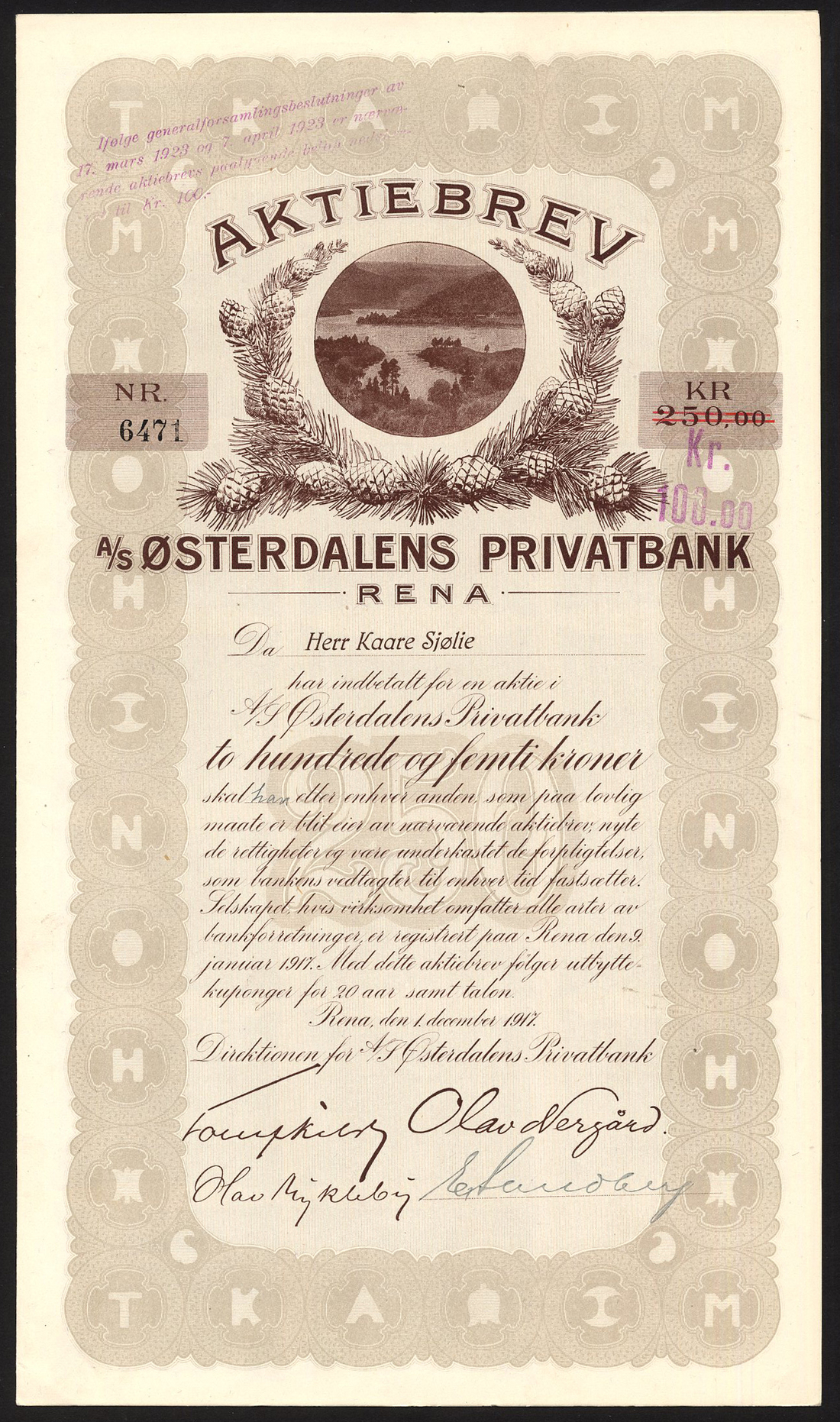(x) Norway: Østerdalens Privatbank, 250 krone share, overstamped with 100 krone, Rena 1917, no.6471, vignette of the river at top, ornate border, brown and olive, with coupons, extremely fine.