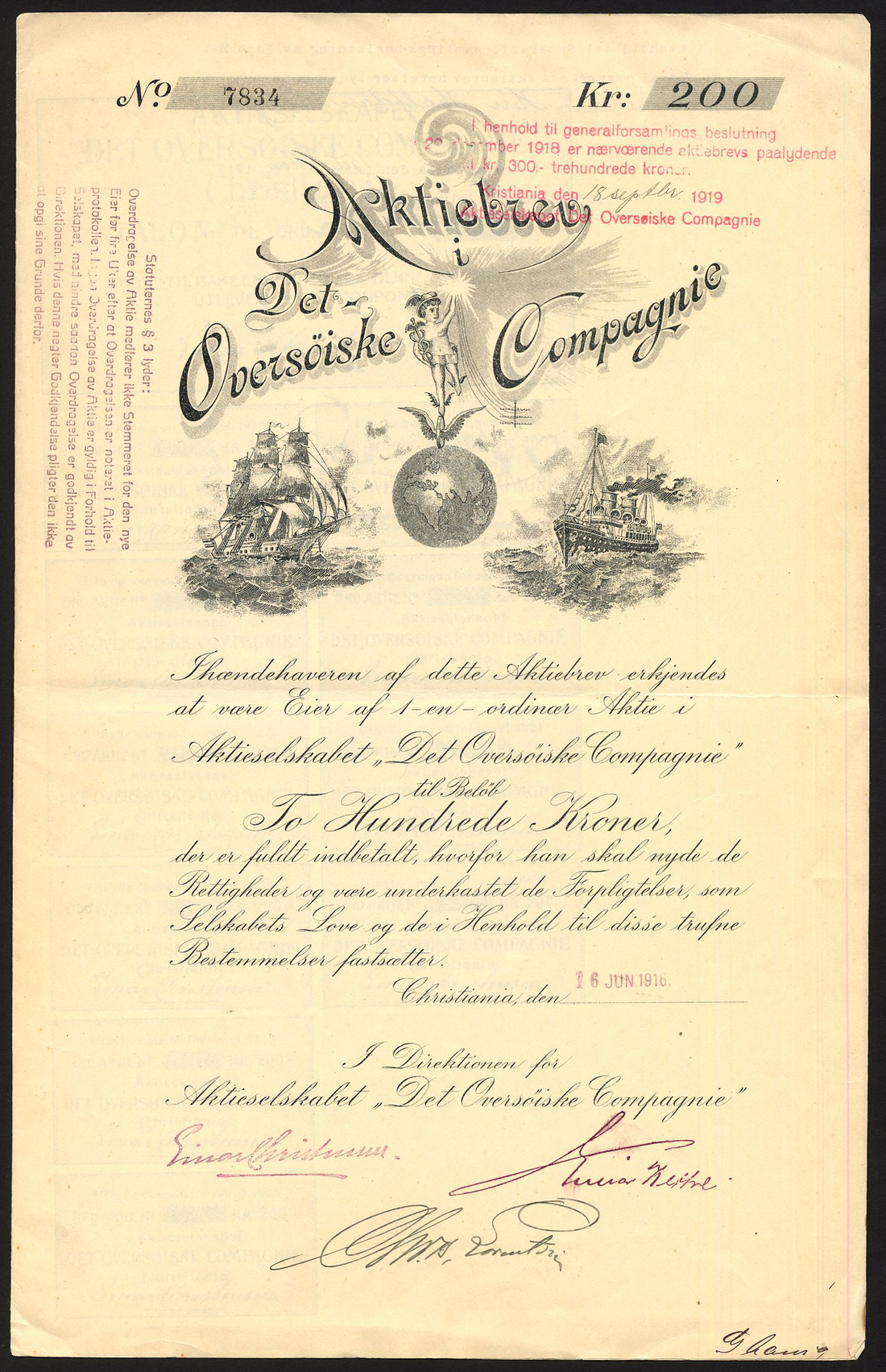 (x) Norway: Oversöiske Compagnie, 200 krone share, Christiania [1916], no.7834, sailing boat, steam ship and allegorical figure with globe at top, black, with coupons, very fine.