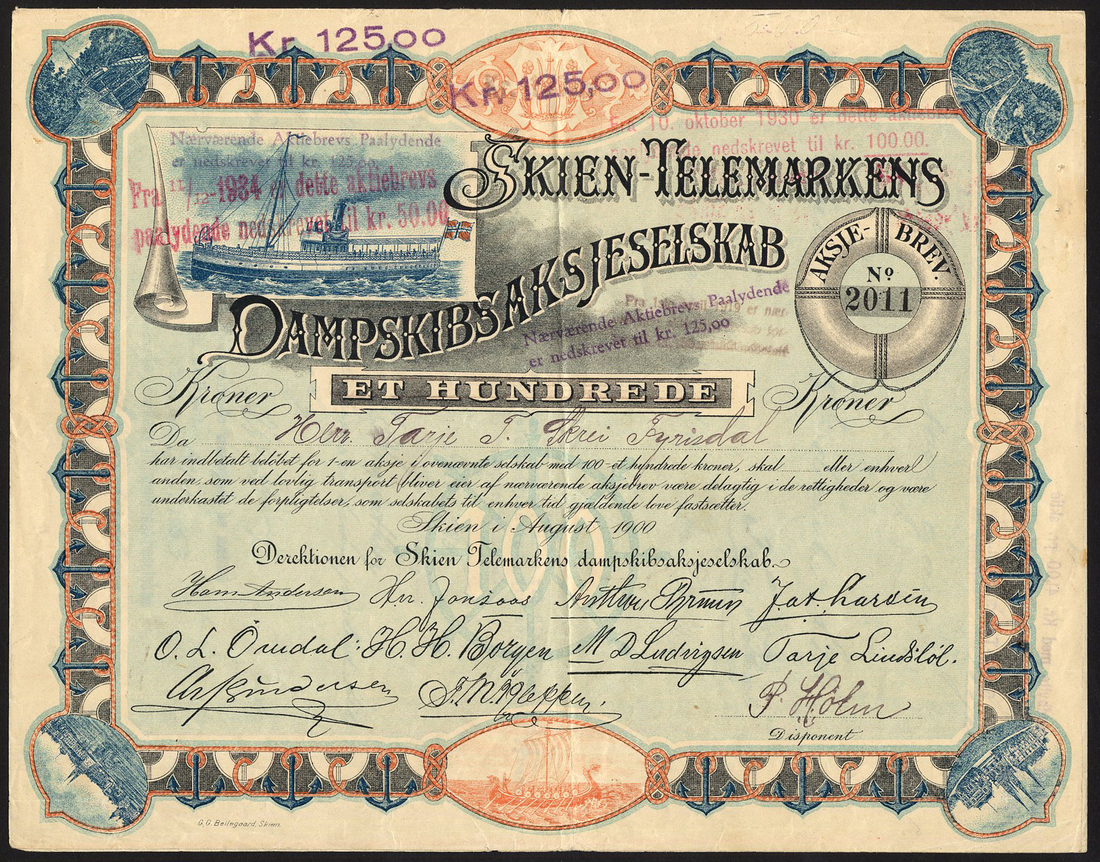 (x) Norway: Skien Telemarkens Dampskibsaksjeselskab, 100 krone share, Skien 1900, no.2011, steamship at top left, ornate border of anchors, black, blue and red, very fine.